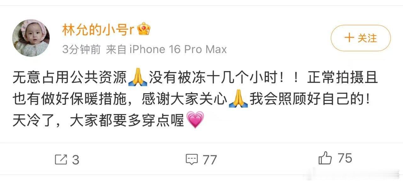 归鸾林允方报平安林允报平安了,说身体无碍,大冬天的拍戏要注意身体很正常,期待大美