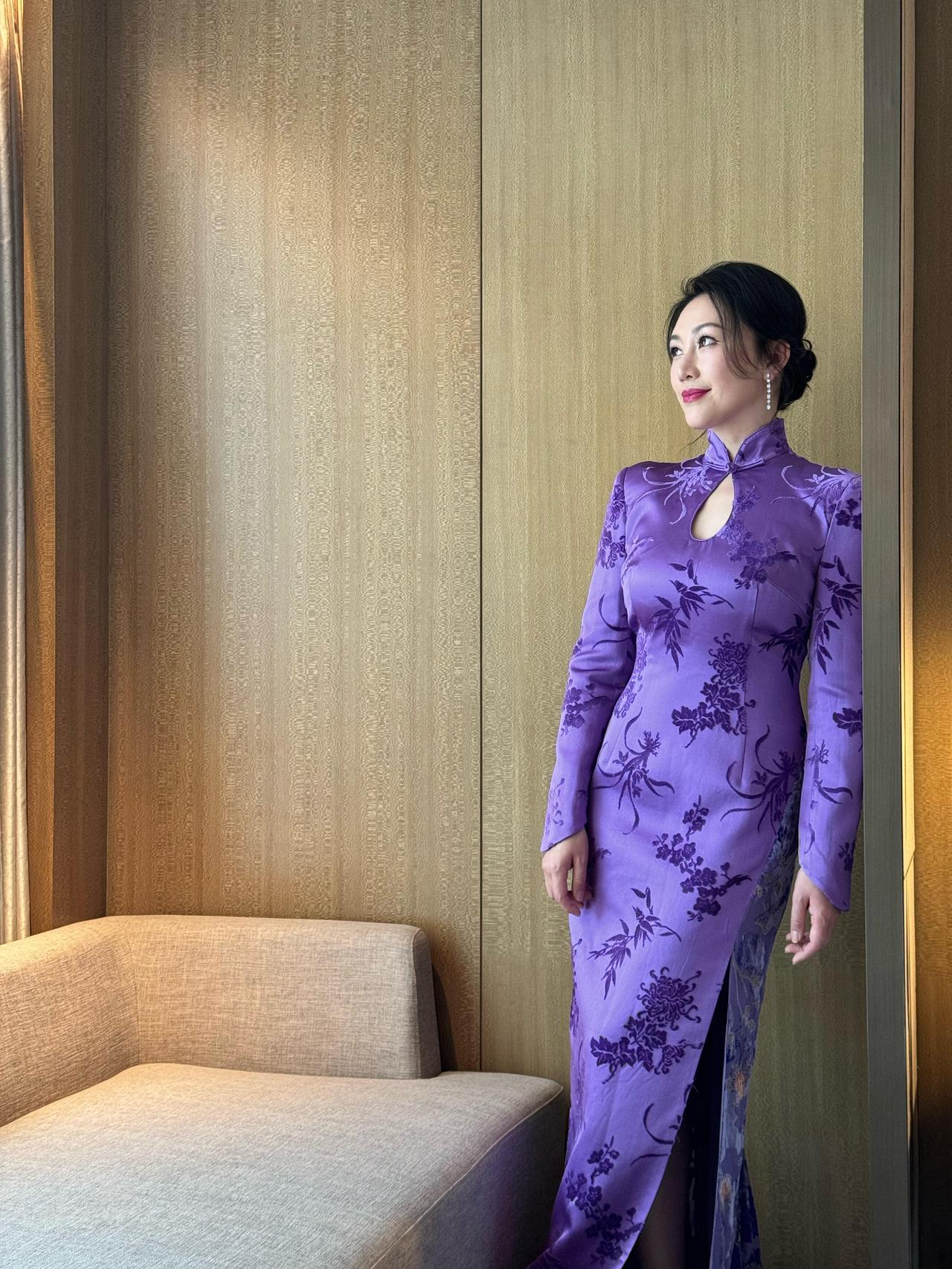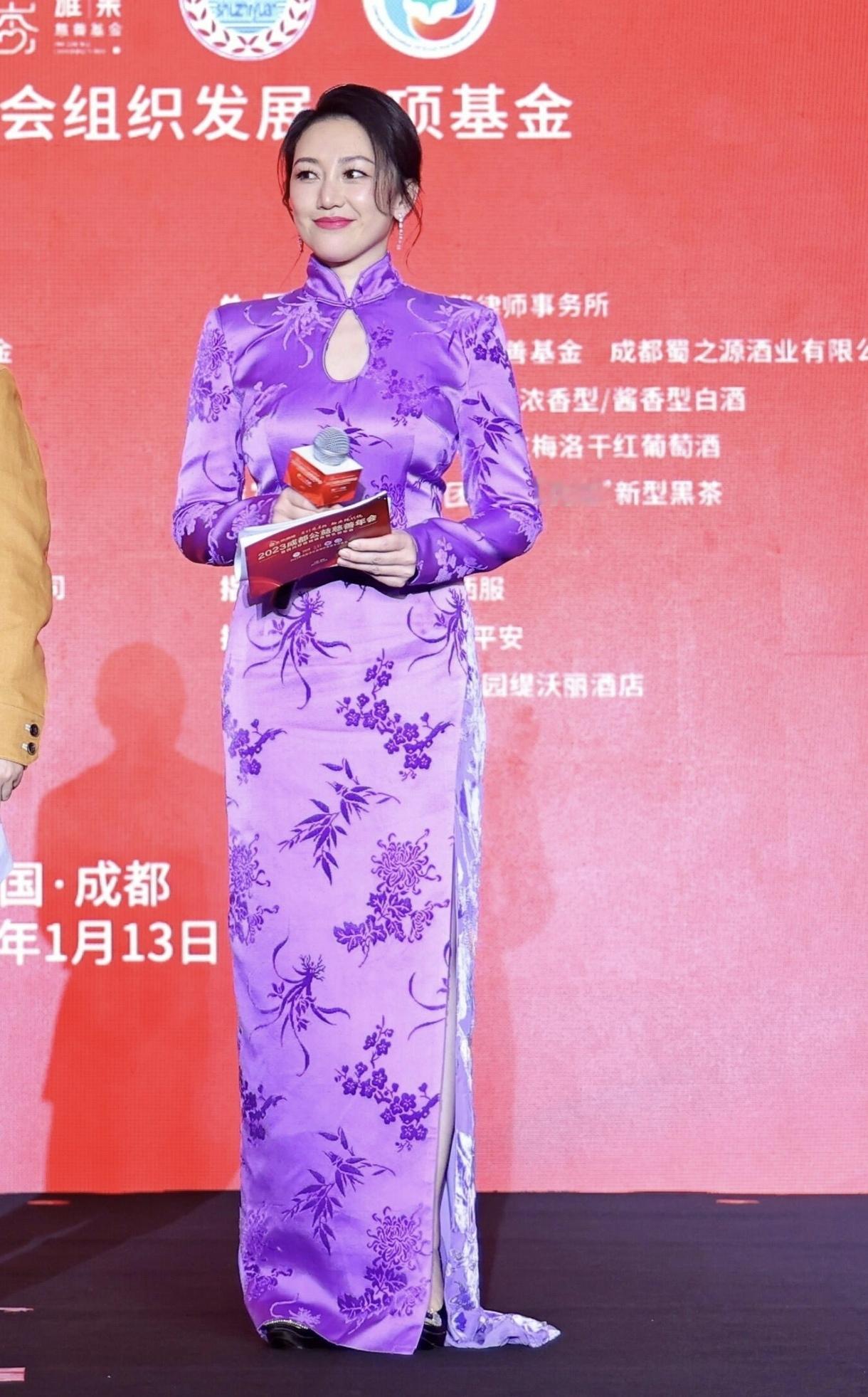 主持人李丹穿紫色旗袍真是不一样的韵味,成熟阿姨太美了!主持人穿搭礼服