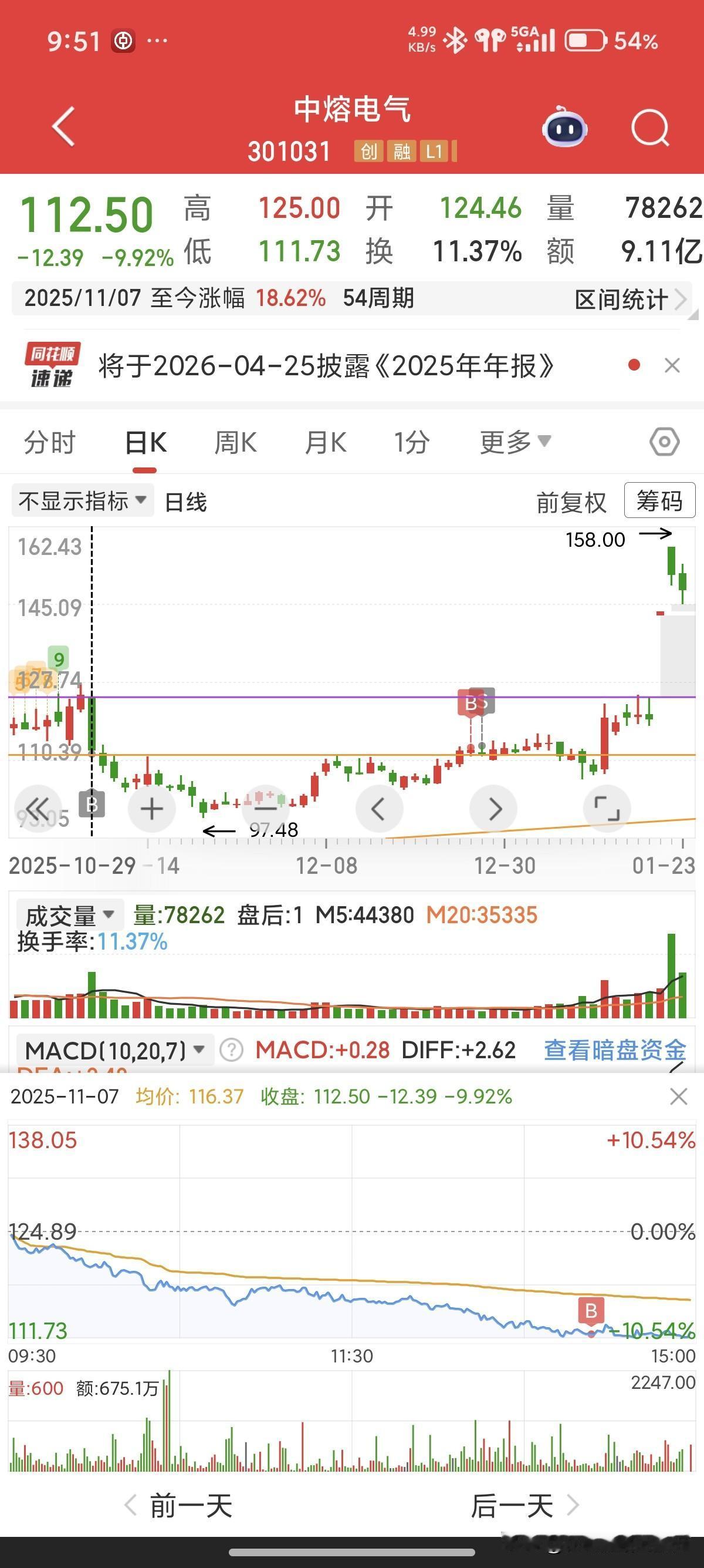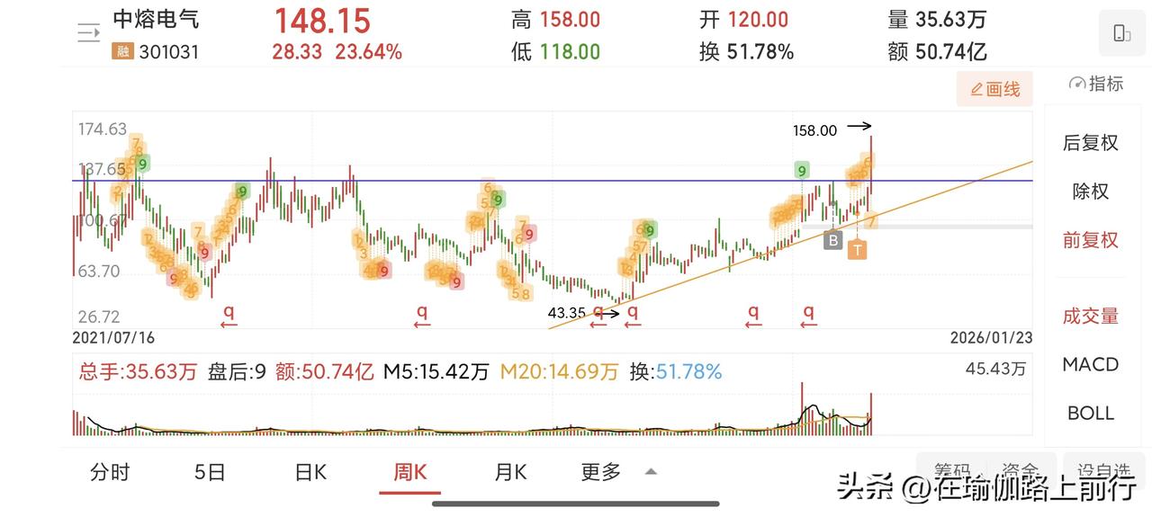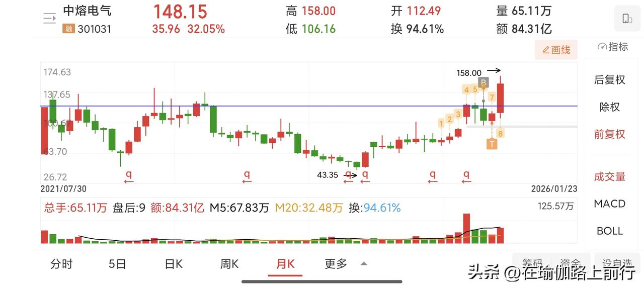 复盘中熔电气(失败案例) 图一月线:一根大阳线后面,调整了三个月。为什么?大阳线的量太大。高量之后通常要回调。 图二周线:看那根趋势线,股价每次碰见,就往上涨。再看缺口,已经两次确认,是强强支撑。 图三图四日线:先说买点,为什么在大阴破位的情况下买入呢?因为当时中科和海当合并没能成功,中科也是跌停。我就在找这种利用消息来洗盘的个股。本来是想长线的,但高估了自己的耐心。 大阴后,跌了10天见底,从见底到启动36天。从大跌买入到现在两个月,18%。如果是大资金,这妥妥的白送钱。 教训:散户还是做右侧,等着,等到站稳大阴底或大阴顶。如果连寂寞都忍受不了,那你不配财富自由,也就是个赌徒。这个股下周看看,要是量能放大,也是入场机会。