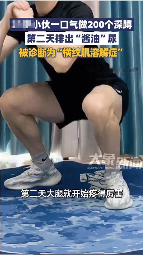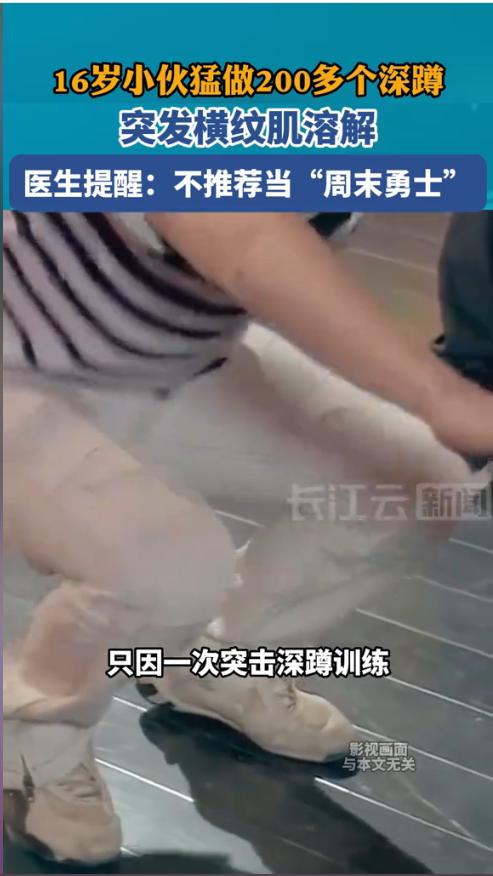 “悲剧还是发生了!”近日,一16岁男孩为了锻炼,竟一口气猛做200多个深蹲,做完后双腿剧痛甚至无法站立,紧接着开始恶心呕吐,尿液竟变成吓人的酱油色!紧急送医后,竟确诊横纹肌溶解,还引发急性肾损伤!医生:健身猛练真会伤肾! 如今健身成为年轻人的潮流,但很多人想快速练出效果,于是忽视了运动的科学规律。尤其是“周末勇士”——平时不锻炼,周末集中猛练,看似努力,但其实极易让身体超负荷。 据媒体1月24日报道,16岁初中生小伙平时严重缺乏锻炼,这天周末时他在网上刷到别人的健身视频,于是便一时兴起决定开始健身,然后就一口气猛做了200多个深蹲。 做完后,他只觉得头晕目眩,双腿酸痛难忍,以为只是普通的肌肉疲劳,便没在意,休息了一会儿。可没过多久,他就开始出现恶心、呕吐的症状,甚至上厕所时尿液颜色也变成酱油色,精神状态急剧变差,家人见状,立即将他送往医院抢救。 经过医生全面检查,小伙确诊为横纹肌溶解综合征,且病情已引发急性肾损伤,情况十分危急。 医生解释,横纹肌溶解是因肌肉过度受损,肌红蛋白等有害物质大量释放到血液中,这些物质会堵塞肾小管,严重损伤肾脏功能,若不及时治疗,可能引发肾衰竭,危及生命。 由此可见,健身一定要循序渐进,不要突然进行高强度、大运动量的锻炼。尤其是平时不怎么运动的人,应从低强度、少量的运动开始,逐步增加运动量和强度才行。 信息来源:《16岁小伙猛做200多个深蹲险丢肾,医生疾呼:不推荐当“周末勇士” (来源:潇湘 晨报)