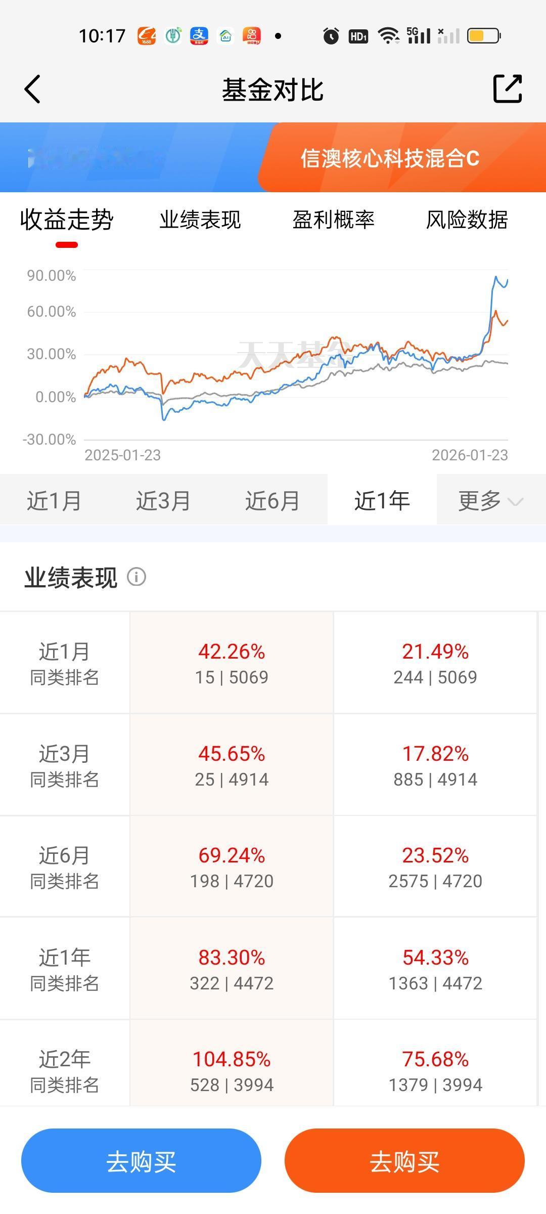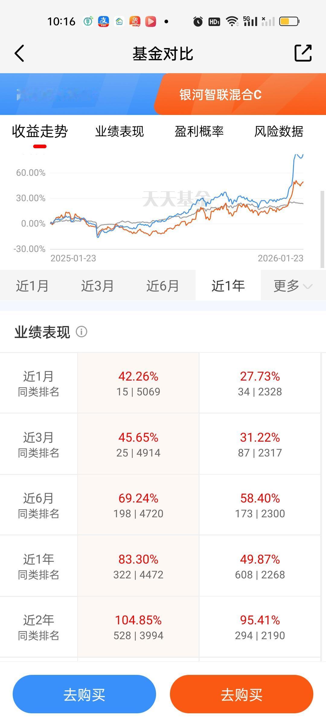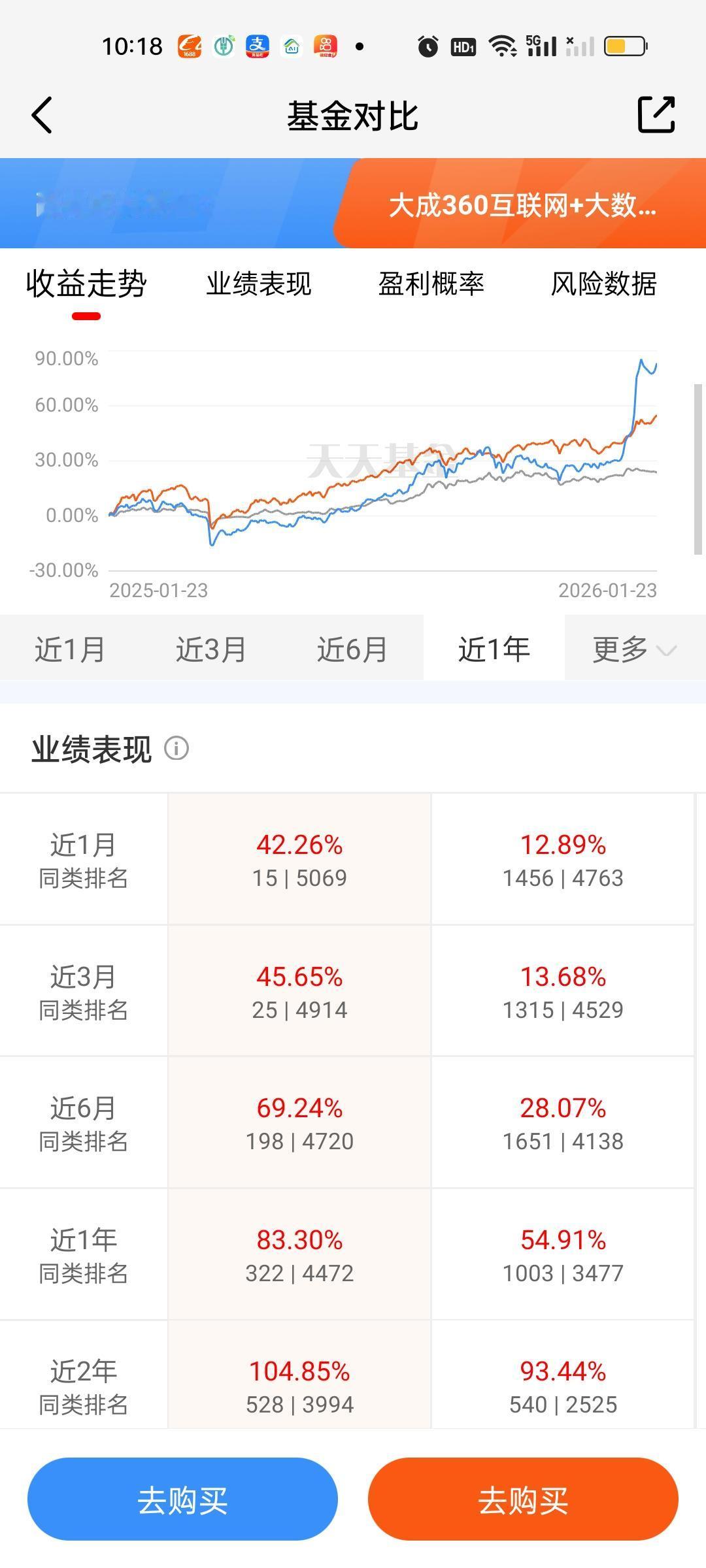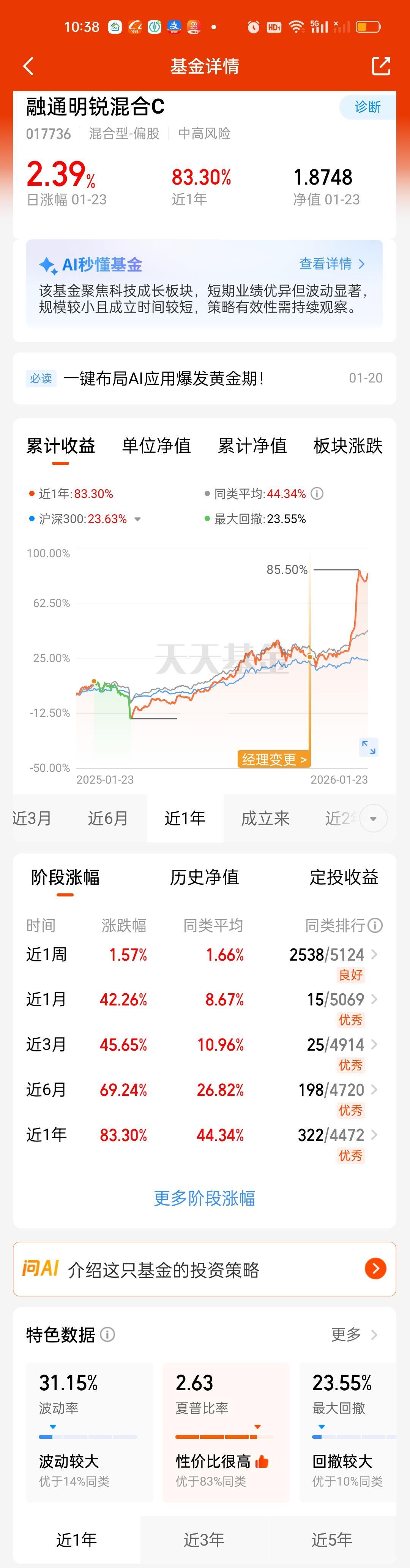 上一篇因为篇幅有限,AI应用板块还有多只对比图发不出来,这一篇补上。目前整个AI应用板块表现最好的还是明锐。它今年以来的收益在19100只基金里排名第一。曾几何时这个位置还属于德邦稳盈,当时AI应用板块一共还不到10只基金,可供选择的基金是非常少的,但基金经理一顿骚操作彻底葬送好局,连续多个交易日的超级低开把人品彻底败光。机会肯定不是每天都有的,有些机会错过了就错过了!