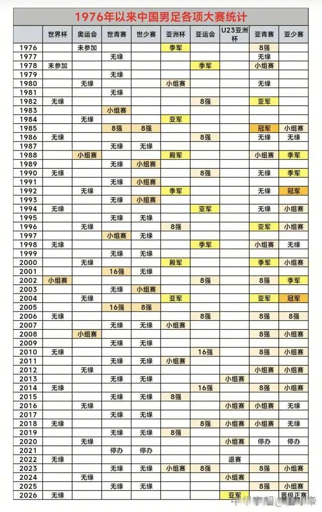 中国男足最近五十年历史战绩,这次亚军已经是2004年以来最佳 ,值得祝贺了!希望U23国足球员不要气馁,继续努力。争取以后在成年国足也能打进亚洲四强甚至决赛,加油💪