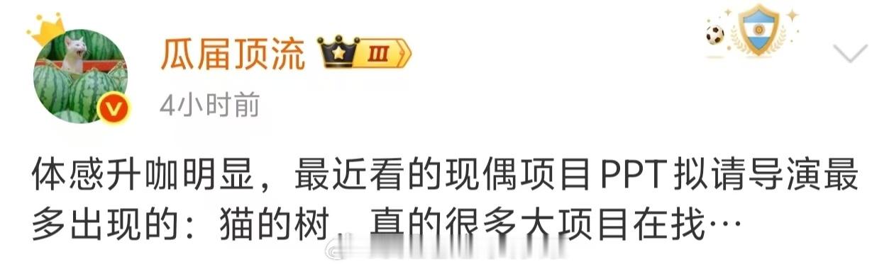 猫的树 升咖 曝猫的树手上现在全是现偶大项目 猫的树最近因为《轧戏》播出效果不错,除柠萌外,后续还接到了其他大厂大项目的邀约,很多现偶拿着他过会,升咖挺明显的,挤入现偶头部导演梯队了 猫的树的男女主衣服从来没丑过