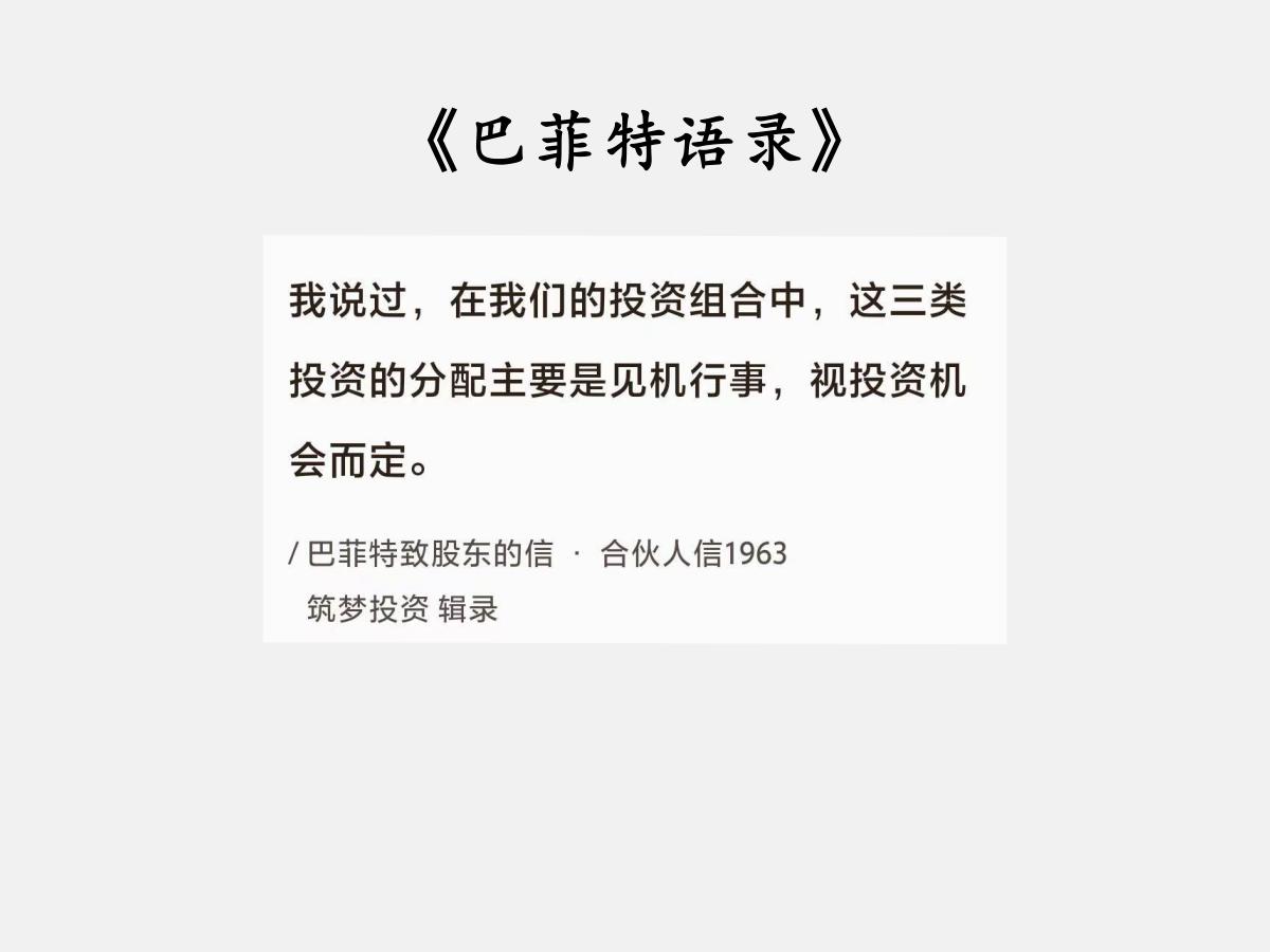No.114 巴菲特谈“投资机会” 巴菲特曰:“我说过,在我们的投资组合中,这三类投资的分配主要是见机行事,视投资机会而定。” 巴菲特的三类投资是指控制类、低估类、套利类。其中,低估类又可分为基于产业资本视角的低估和相对低估两小类。 股市最大的特点就是阴晴不定。谁也料不准它短期内是涨是跌,K线图又该如何画。因此,投资机会的出现有很大的随机性。 所以,无论哪类投资,只要出现足够吸引人的机会,那就不要犹豫,牢牢抓住,而不是等等看。一鸟在手,胜过双鸟在林。 当然,如果都出现了投资机会,那就好好运用一下“比较思维”。谁风险更低,胜率更高的同时,潜在回报率还更高,那就把子弹(闲钱)打给谁。 在股市里,总有人想等等再买或等等再卖,总想着买在更低价,卖在更高价。很多时候,机会就在这犹豫不决和贪婪之心的作祟下偷偷溜走了。 长远看,少买或多卖几毛几元钱,也影响不了什么。所以,当价格合适时,该买就买,该卖就卖,果断点儿。