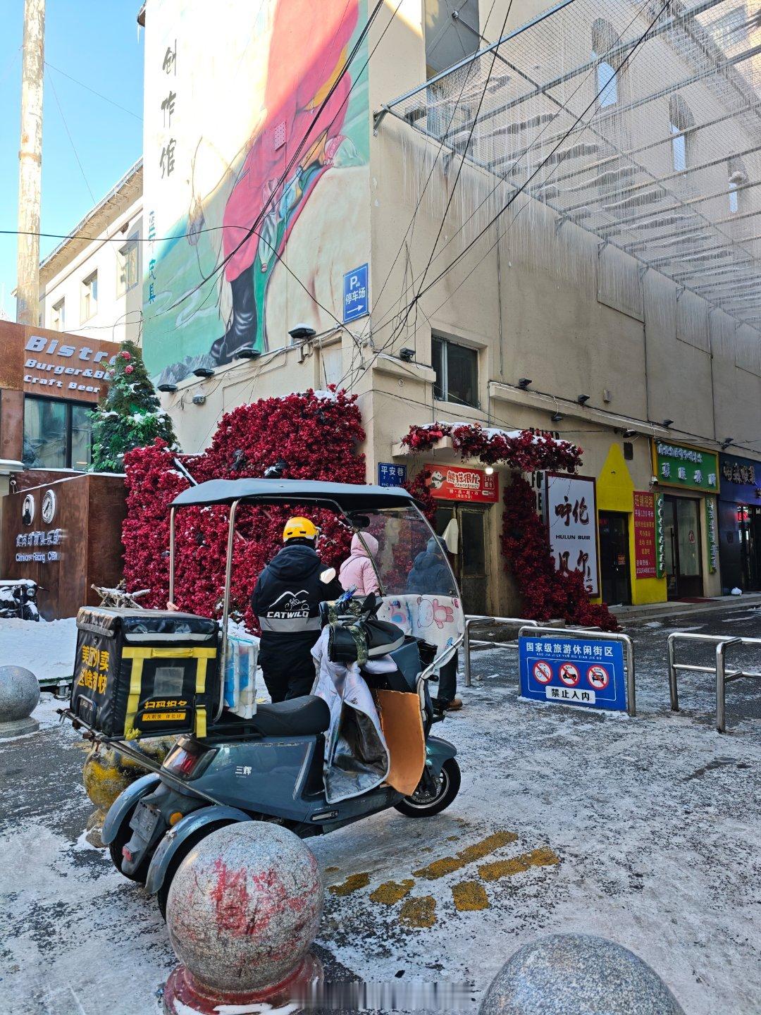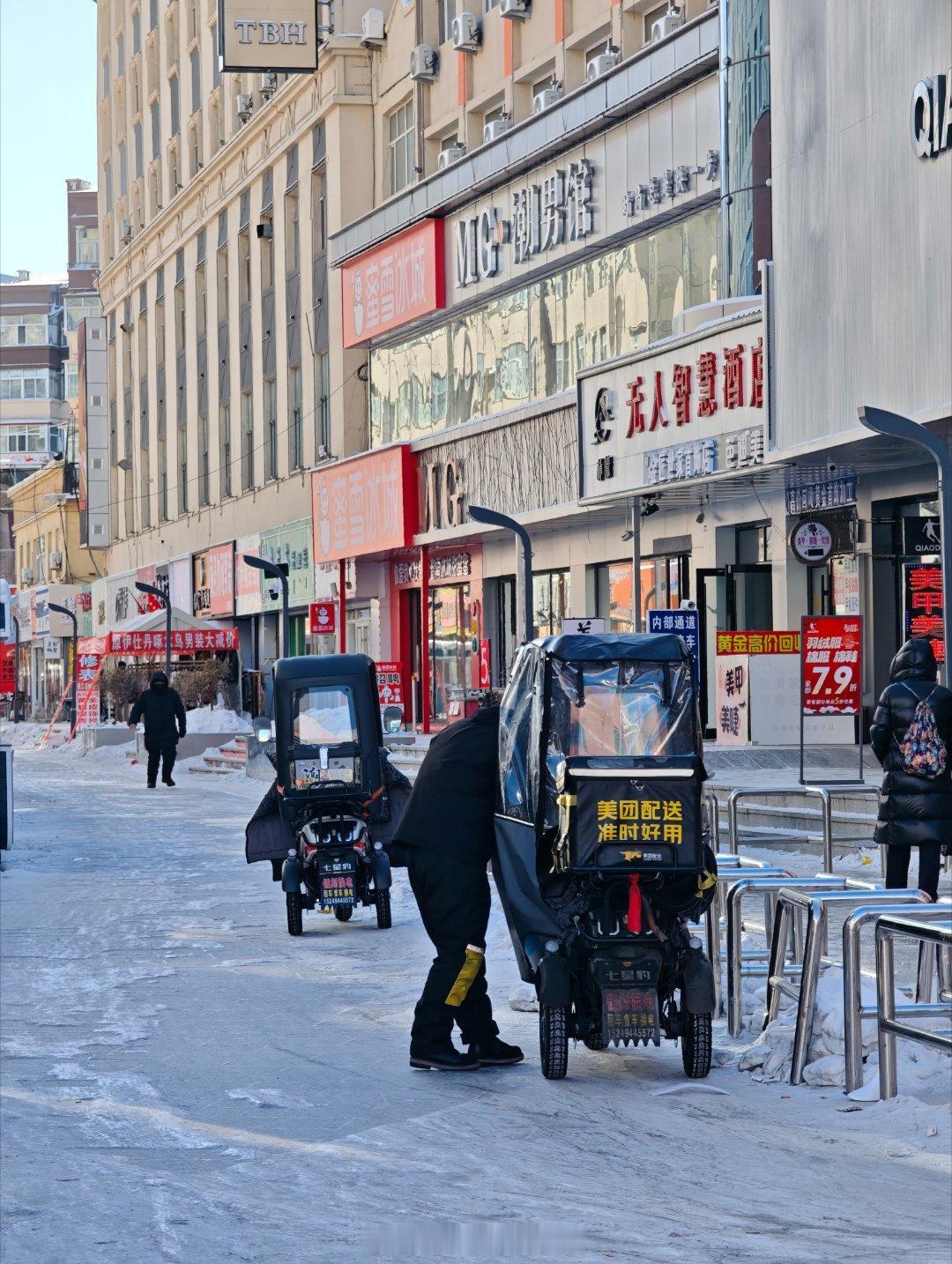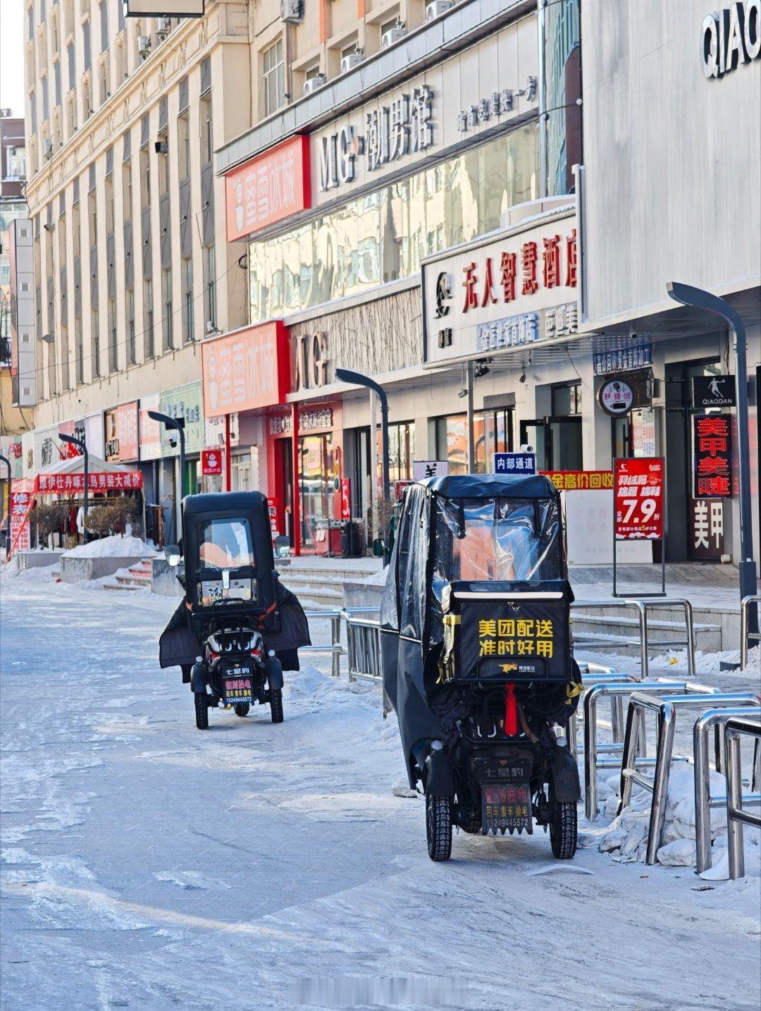 哈哈一个地方有一个地方的美团外卖三轮小电驴应该挺稳当~还有各种防雪防风小棚子~否则这零下三十多度的户外,真扛不住五分钟