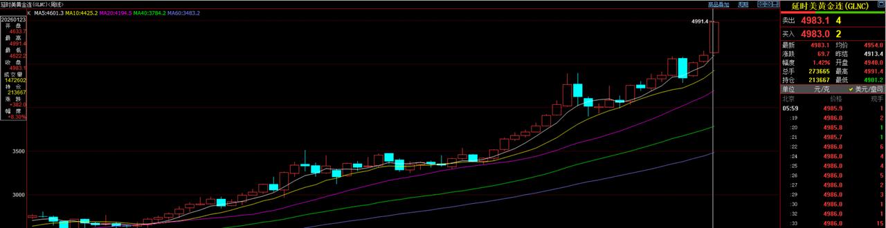 刚刚过去的一周, 国际黄金连续合约, 大幅上涨,再创新高。 当周开盘价为4633.7美元/盎司, 盘中最高价4991.4美元/盎司, 最低价4622.2美元/盎司,收盘价4983.1美元/盎司, 上涨382美元,涨幅8.3%,为连续第三周上涨。 对于不断飙升的金价, 期货小褚只能继续仰望了, 未来突破五千只是时间问题!