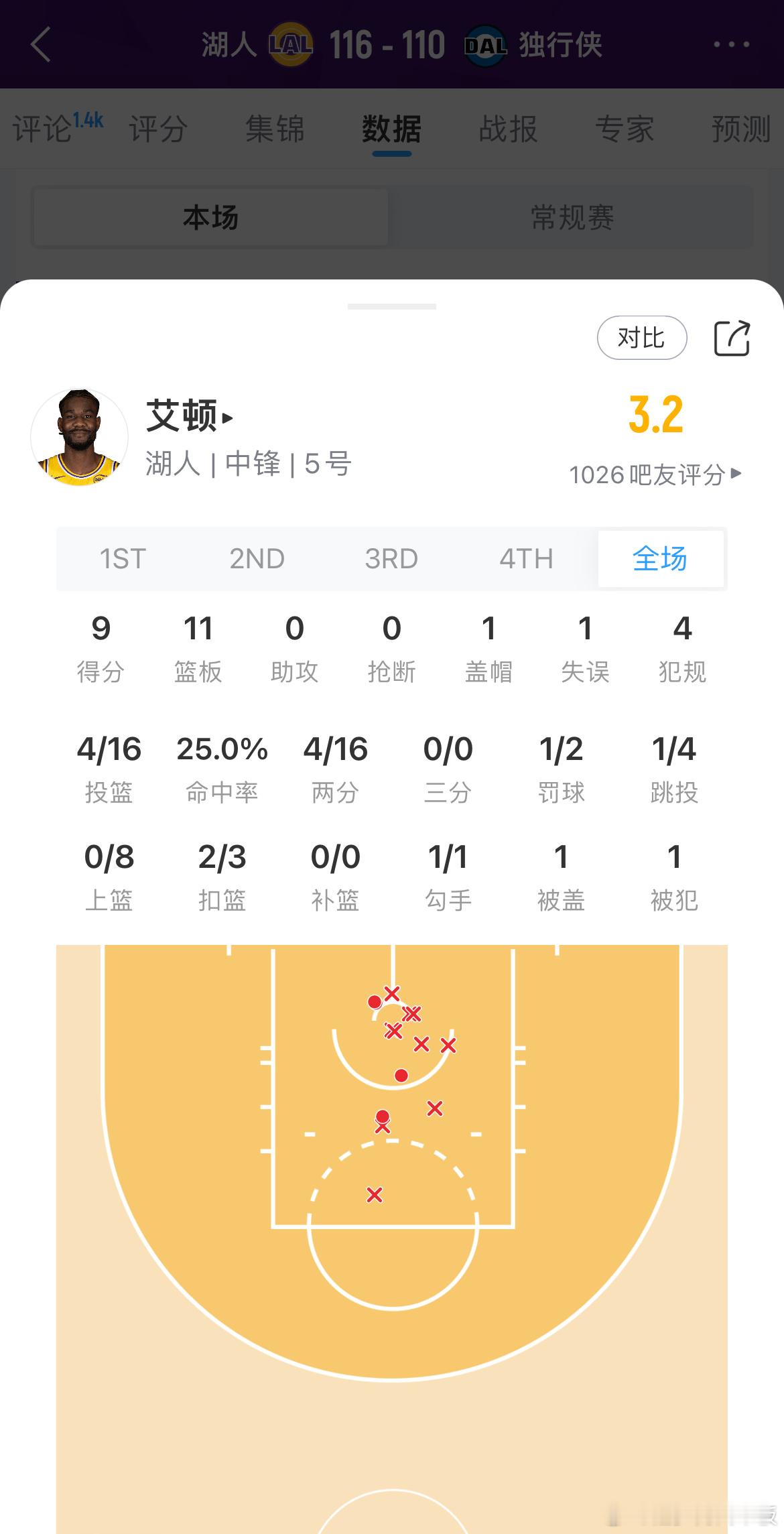艾顿近3场比赛表现:4分8篮板,投篮命中率40%4分5篮板,投篮命中率40%9分11篮板,投篮命中率25%场均5.7分8篮板,投篮命中率31%。湖人vs独行侠