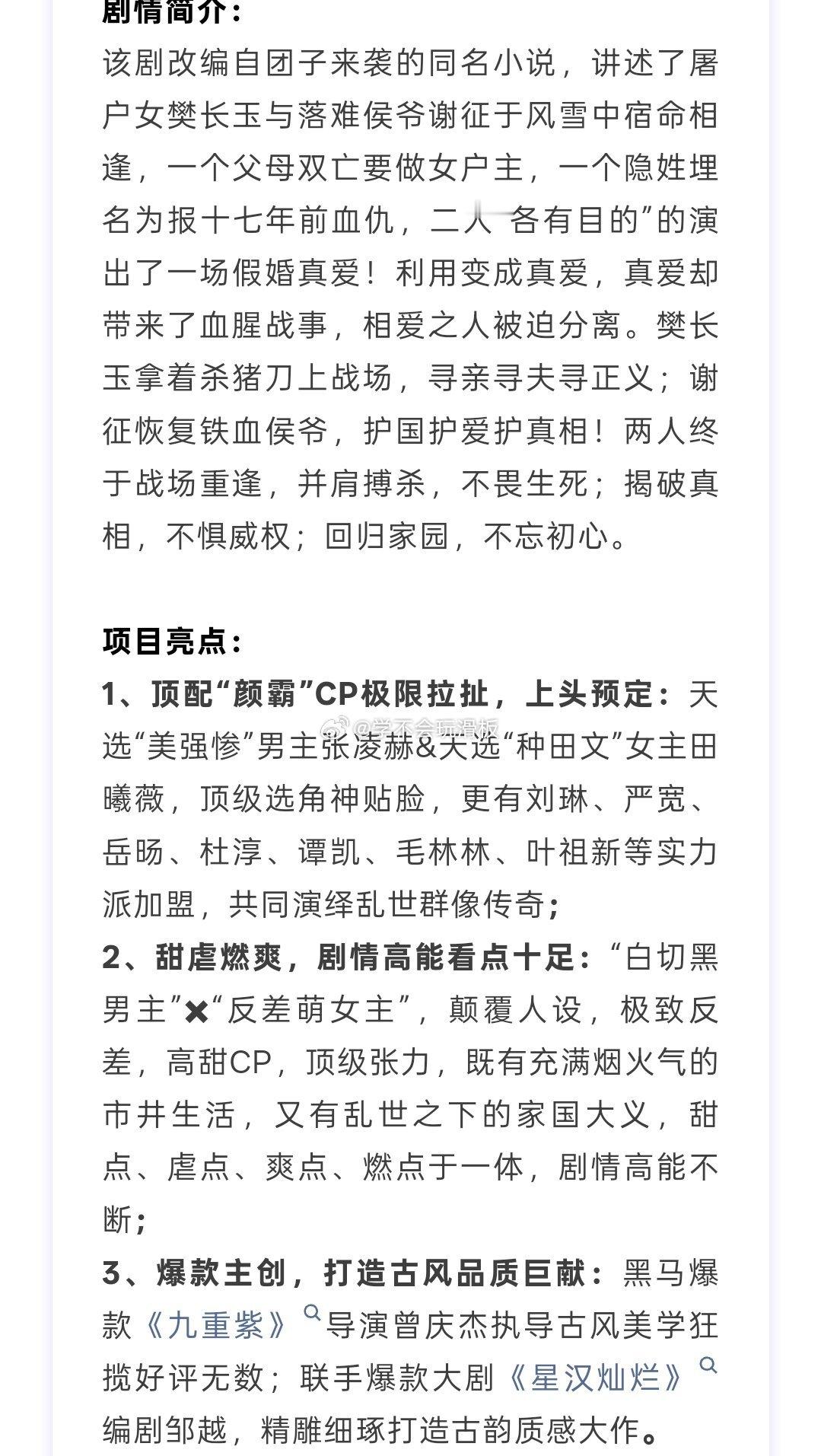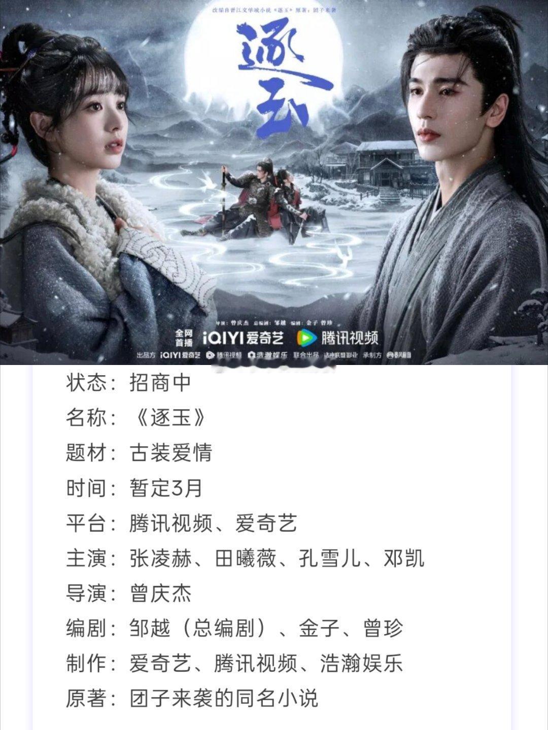 张凌赫、田曦薇、(排名不分前后)《逐玉》开启招商,暂定3月播出。
