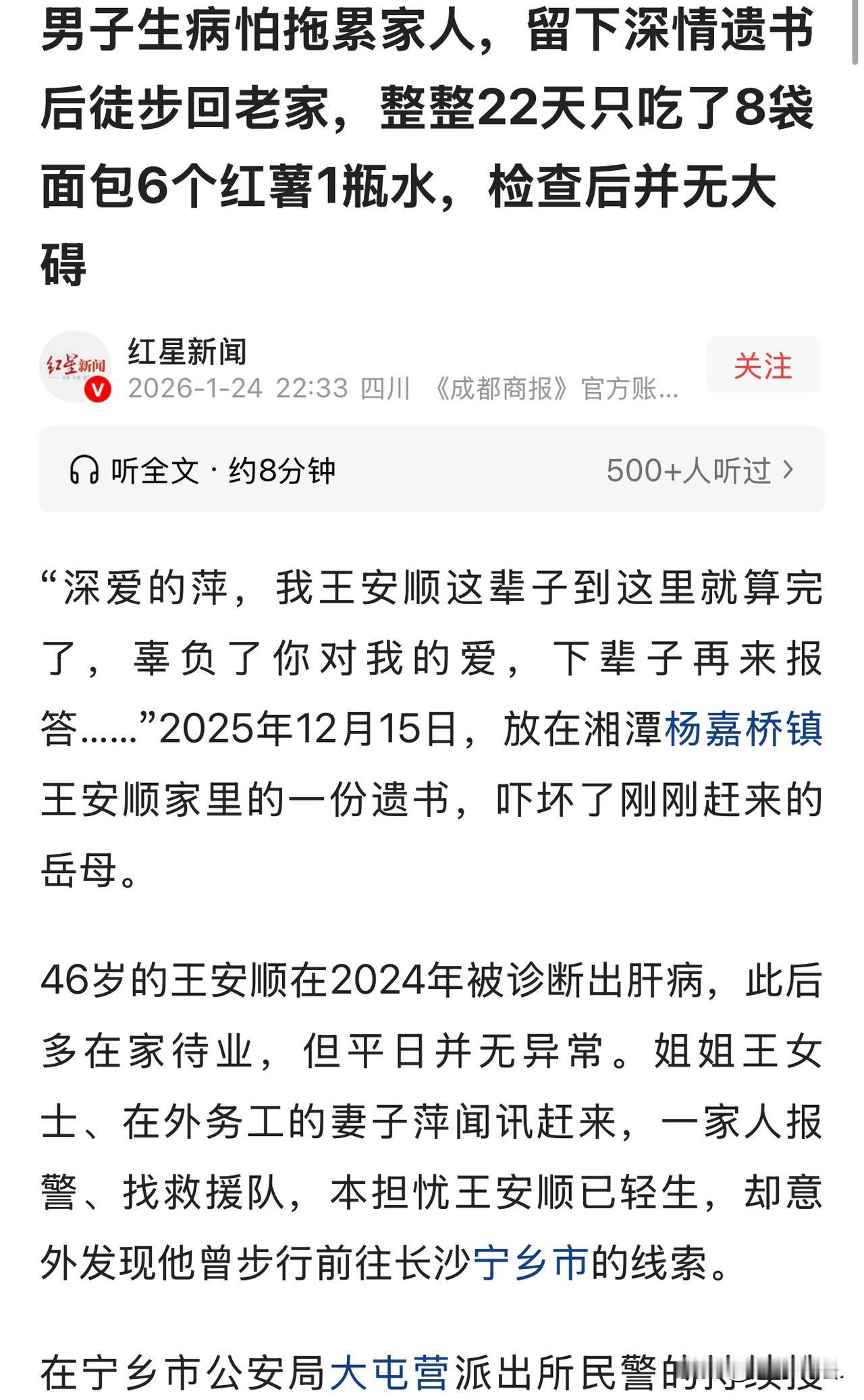 “人都这样,不是病死的,是吓死的!”湖南湘潭,46岁男子被确诊肝硬化,他不想花钱治病,怕到头来人财两空。于是,给妻子留下遗书,决定回老家等死。他用22天,徒步回到老家,期间,只睡过一宿觉,吃了8袋面包6,个红薯1瓶水。岳母发现遗书,吓得不轻,赶紧报了警。家人找到他时,他早没了精神,随后,家人将其带回了家。结果医院告知,他的病根本不严重,只要不再酗酒就能康复! 2024年,王先生查出了肝硬化,可他平时压根没觉得身体不舒服。医生说的挺严重,他自己心里也不顶事,越想越怕,直接不敢出去打工了。 家里的担子一下全压在妻子身上,妻子在外累死累活挣钱,他却在家待着混日子,越想越觉得生不如死,怕自己病发拖累全家,最后人财两空。 2025年12月15日,王先生留下一封遗书,说这辈子辜负了妻子,下辈子再报答,然后就不辞而别,想着叶落归根,死在老家长沙宁乡。 还好岳母来家里看望,发现遗书吓出一身冷汗。 这明显是想不开啊!赶紧联系女儿和王先生的姐姐,一家人急得不行,又报警又找救援队。顺着线索一查,王先生是往老家方向徒步去了。 这一路王先生没带钱,心灰意冷的,22天里就靠好心人给的8袋面包、6个红薯和1瓶水维持生命,只睡过一夜,风雨无阻地往前走。直到1月5日,家人才在200公里外的娄底冷水江找到他,那会儿他已经蓬头垢面,整个人都没精气神。 赶紧送医院检查,结果让人哭笑不得:医生说他的病根本不严重,只要不再酗酒就能康复,还有医保,压根不会拖垮家里。合着王先生这通折腾,全是自己吓自己,虚惊一场! 王先生这事儿,说好听点是心思重,说难听点就是糊涂透顶! 好好的日子,被自己脑补的“绝症”搅得天翻地覆,真是不值当。 肝硬化是病,但不是判了死刑,医生的话是提醒,不是催命符,怎么就不能沉下心问问清楚、好好治疗? 自己吓自己就算了,还撂挑子不干活,把全家重担甩给妻子,这哪是男人该干的事? 更离谱的是动不动就想“叶落归根”寻短见,留封遗书就跑路,完全没顾及老婆孩子、家人的感受。 22天徒步200公里,遭罪不说,家人急得报警找救援队,又是担心又是花钱,纯属瞎折腾。 最后查出病不严重,有医保、戒酒就能好,这结果多讽刺?人活着哪能没坎儿,有病就治,有难就扛,遇事不沟通、光钻牛角尖,既坑了自己也坑了家人。 日子是过出来的,不是吓出来的,但凡多点心胸、多跟家人商量商量,也不至于闹这出虚惊一场的闹剧!