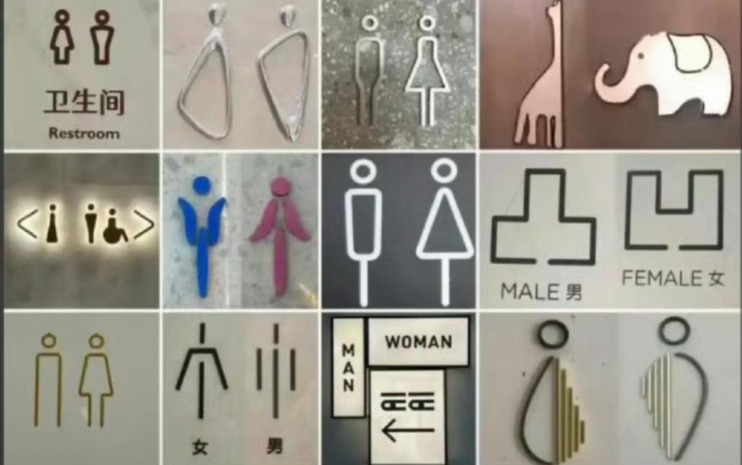 现在商场厕所标识,是逼我考艺术学院吗? 真的要被现在商场的厕所标识气笑,简直是智力测验和艺术鉴赏双重考试! 见过用大象长颈鹿区分的,见过画京剧脸谱的,还有更离谱的“听雨轩”对“观瀑亭”。 我是来上厕所的,不是来吟诗作对的啊!年轻人都得琢磨半天,那些老人、小孩还有近视的朋友,岂不是直接傻眼? 国家早有标准,男厕是裤装图形、女厕是裙装图形,但这标准居然不是强制的!有些商场为了追求“网红感”“高级感”,把标识搞得花里胡哨。 完全忘了公共设施首先要“让人看懂”。之前就有网友因为标识模糊误入女厕,还有人蹲守5分钟不敢进,尴尬得脚趾抠地。 公共服务的核心不就是方便大家吗?加个“男”“女”汉字能掉价吗?那些花在抽象设计上的心思,不如多考虑点实用性,字号放大点、颜色对比强点,让所有人都能一眼看明白不好吗? 你们有没有遇到过离谱的厕所标识?