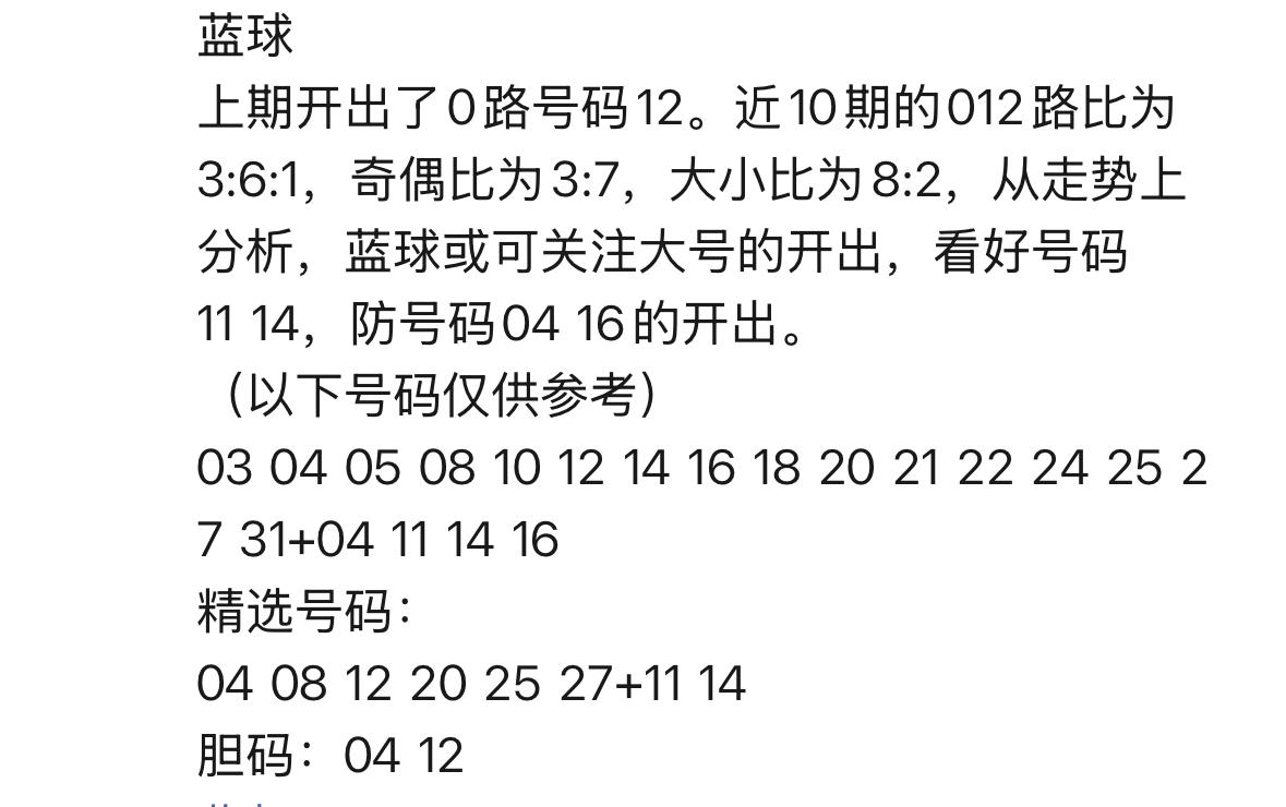 双色球第26011期即将于今晚开奖,当前奖池依然高达28.6亿元!备受关注的辛丹丹再度出击,她精心挑选出一组“6+2”心水号码:红球04、08、12、20、25、27,蓝球11、14。这组号码可谓看点十足: 看点一:红球04与上期奖号重合,形成重码走势。 看点二:多达四个号码(08、20、25、27)与上期奖号构成斜连码关系,走势呼应明显。 看点三:红球04与12被列为胆码,凸显核心布局。 看点四:蓝球重点倾向大数11、14与16,其中11与14呼声更高。不少彩友认为本期蓝球大概率落在大数区间,然而彩市往往出人意料,是否真能如愿,还需静待分晓。 对于辛丹丹这组精挑细选的号码,您有何见解?您心中是否另有钟情的数字?一切悬念,皆待今晚开奖之后,尘埃落定。