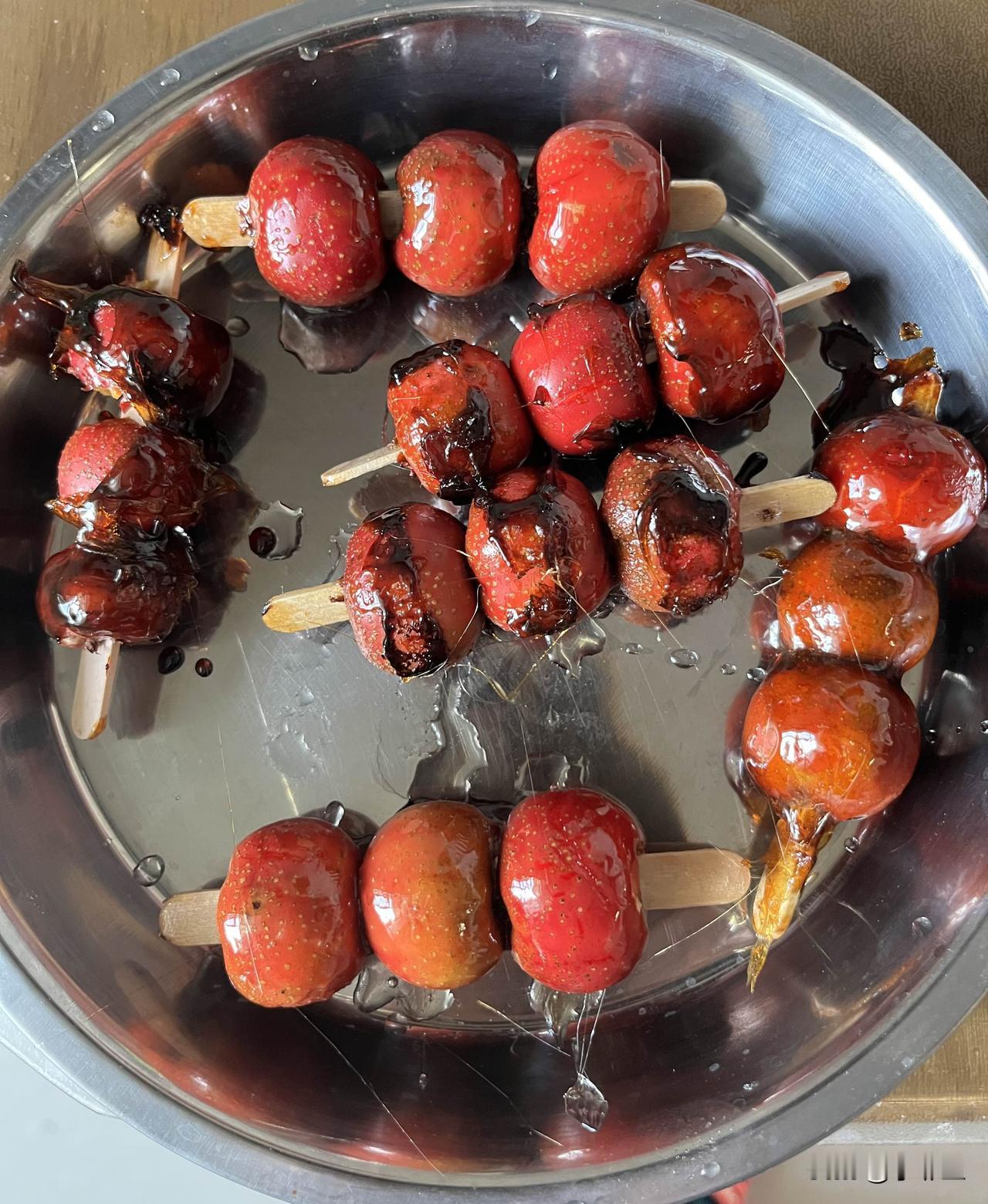 会做糖葫芦了,今天第一次做,摆的不太整齐,卖相不太好,但是味道和买的一样一样的,下次做再放点儿芝麻,更好吃了…… 想知道怎么做吗?不想知道我也告诉你[偷笑] 锅里放入凉水和白糖,先用大火熬开了再转入小火,有的做法是先放开水和白糖,熬到出白沫后,把山楂串沾一圈白糖后拿出来放盘中就好了,我今天的糖都有丝了,像拔丝地瓜一样[偷笑] 看着有食欲吗[偷笑]