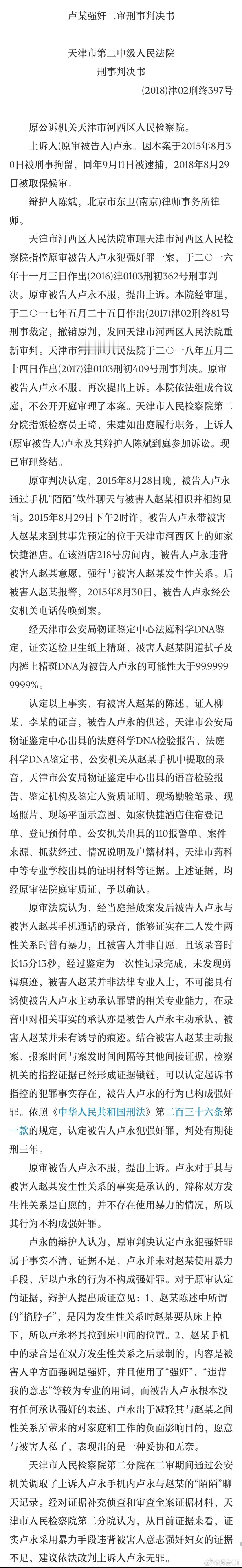 居然让他遇到正规法院了,算他幸运。刚刷到个比较罕见的案例,案号为(2018)津02刑终397号。根据裁判文书,这案子先后经过了2016年的一审、2017年的发回重审、2018年的再审、2019年的二审。历时近4年,被告人终获无罪。本案的案情,其实并不复杂。2015年8月28日晚,被告人卢永通过MM与赵某相识,并相约见面,在房间内,两人发生了关系。后赵某报警,同年8月30日,卢永经公安机关电话传唤到案。DNA鉴定显示,送检卫生纸上的精斑、赵某阴道拭子及内裤上的精斑DNA,均来自被告人卢永。此外,公安机关还从赵某的手机中提取了一段录音,其上显示,卢永曾在通话中多次向赵某认错并请求私了。原审法院认为,根据前述录音,足以证实两人发生关系时曾有暴力,且赵某并非自愿。此外,该录音时长15分13秒,经鉴定为一次性记录完成,未发现剪辑痕迹,由于赵某并非法律专业人士,不具有诱使被告人卢永主动承认罪错的专业能力。故而,结合赵某主动报案、报案时间与案发时间间隔等其他间接证据,法院认为,检察机关的指控证据已经形成证据锁链,可以认定起诉书指控的犯罪事实存在。原审法院后以强奸罪,判处被告人卢永有期徒刑3年。而二审法院则认为,虽然卢永在通话中多次向赵某认错并请求私了,但不能认为卢永承认其对赵某实施了强奸,卢永的认错行为亦不能视为是承认犯罪。二审法院还表示,赵某对于来天津的目的和过程、其是否向包括卢永在内的网友索要钱财或返程机票等事实,每一次的陈述内容均不相同,此外,对于被强奸的过程,也存在前后不一致的问题,且其中的部分内容可以被证伪,同时也没有任何其他证据可以与赵某的陈述内容相印证,故而,赵某所谓其被卢永使用暴力强奸的陈述,真实性无法确认。综合全案证据,二审法院表示,他们无法得出唯一的排他性结论。最终,二审法院宣布,撤销原审判决,改判卢永无罪。实务案例看一看 专栏 · 读一读裁判文书