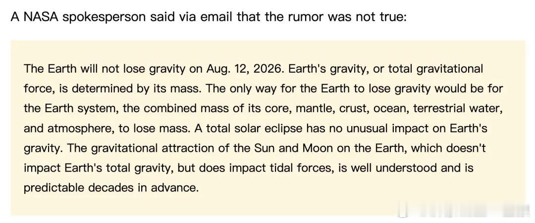 【2026年地球会失重7秒致千万人死亡?末日预警谣言溯源】近日,一则“2026年8月12日地球将失去引力7秒”的消息在国外社交媒体上疯传。国内多个相关话题也引发热议。★微博截图这则传言声称,届时人类会集体浮空、月球脱离轨道,甚至全球超 4000 万人丧命,还假借 NASA 名义背书。但回归牛顿力学的基本框架,所有夸张描述都不攻自破。而要破解这则“地球将失去引力 7 秒”的谣言,也根本无需高深的天体物理学知识——只要还记得中学物理课本中的基础常识,就能轻松看穿其荒谬本质。 01 谣言溯源: 无权威来源的“嫁接式谎言”这则谣言的传播逻辑十分简单:通过标注具体日期(2026 年 8 月 12 日)、编造伤亡数据、绑定权威机构,制造“真实感”;再利用公众对天文现象的陌生感,将当天发生的日全食与“引力消失”强行关联,实则二者毫无科学联系。追溯其信息源头,所谓“NASA 锚定计划”“890 亿美元地下掩体”等关键信息,在 NASA 官方数据库、美国联邦预算公示中均无任何记录,属于完全编造的虚假信源。而 2026 年 8 月 12 日的日全食,是天文学家早已精准预测的常规天象——月球运行至太阳与地球之间形成遮挡,如同乌云蔽日,既不会改变地球质量,也不会影响引力场分布。这种将普通天象与末日预言嫁接的套路,正是此类谣言的典型特征。 02 权威发声:NASA 明确辟谣, 科学共同体集体否定面对谣言扩散,NASA 通过国际权威事实核查网站 Snopes 明确表态:“地球绝不会在2026年8月12日失去引力,这一说法毫无科学依据”。★snops记者Jordan Liles的报道中,引用了对NASA的采访内容。从科学研究的基本逻辑来看,任何关于地球引力的重大变化预测,都必须经过严格的数学推导、观测验证与同行评议,绝不可能通过“匿名传言”的形式传播。截至目前,全球没有任何一家权威科研机构、学术期刊发布过相关研究,足以证明这则谣言的荒谬性。 03 科学内核:中学物理常识+ 观测经验,双重否定谣言科学的核心并非“神奇预言”,而是可重复、可验证的规律一致性——它不是突然降临的奇迹,而是贯穿日常的稳定法则,支撑着人类对自然的认知体系。真正的科学预言或许会揭示未知现象(如爱因斯坦预言引力波),但绝不会违背已被无数实践验证的基本原理;而这则谣言的本质,正是无视这种一致性,编造出与中学物理常识完全相悖的“神奇场景”。1.中学物理常识:引力的本质与不可替代性中学物理课本早已告诉我们:牛顿万有引力定律指出,任何有质量的物体间都存在相互吸引力,引力大小与物体质量乘积成正比,与距离平方成反比(公式为 F=G·m₁m₂/r²)。地球的引力源于其约 5.97×10²⁴ 千克的巨大质量,只要地球质量不发生根本性改变,引力就不会凭空“消失”或“暂停”——这就像一个人不可能在保持体重的同时,突然失去对地面的压力,腾空而起。因为假如历史上曾经发生过哪怕一次,我们地球上的一切、月球和太阳系、乃至整个宇宙,都早已崩溃,不复存在了。结合牛顿第一定律(惯性定律):一切物体在没有受到力的作用时,总保持静止状态或匀速直线运动状态。如果地球引力消失,那么我们将会见到以下现象:地表万物:人类、建筑物、汽车、海洋等所有未被固定的物体,会在地球自转产生的离心力作用下,沿切线方向飞离地表,就像下雨时旋转雨伞从雨伞边缘飞出去的雨滴;天体系统:月球围绕地球运行的向心力完全来自地球引力,失去引力后,月球将以约 1.02 千米/秒的公转速度脱离地月系统;大气层:地球大气层之所以能包裹地表,全靠引力“束缚”,地球对大气的引力进而产生了大气压;失去引力后,大气会瞬间向宇宙空间扩散,地表暴露在宇宙辐射中,生命无法存活。这些后果并非危言耸听,而是中学物理知识的直接推导——只要引力消失哪怕 1 秒,地球生态系统就会彻底崩溃,人类文明根本无法延续至今。而我们如今安然无恙地生活,本身就是对谣言最有力的反驳。2.观测经验:数千年日食记录,从未有过“引力异常”除了基本原理,人类数千年的观测经验也能佐证谣言的荒谬。日全食作为常规天象,全球范围内有记录的观测案例已超千次。从古希腊天文学家泰勒斯预测日食,到天文学家历经千年追逐日食,无数次观测都证明:日食只是光影的自然变化,从未引发过引力异常、地表浮空等“神奇事件”。实际上,现代发生的每一次日食,都是天文学家和天文爱好者的狂欢节,而不是世界末日。如果地球引力真的发生过“暂停 7 秒”,那么在人类历史上,至少会留下一次相关的异常记录——无论是古代文献中的灾异记载,还是地质层中的异常痕迹,但现实是,没有任何证据能支撑这一说法。这种“原理推导+经验验证”的双重逻辑,正是科学否定谣言的核心方法。 04 谣言破解: 掌握两个核心,远离虚假信息这则谣言的传播,本质上利用了公众的“末日焦虑”与科学知识的欠缺。但只要掌握两个核心判断标准,就能轻松识别此类谣言:看信源:权威科学结论必然来自正规科研机构、学术期刊或官方发布,而非匿名帖子、社交平台传言;验逻辑:任何违背中学物理等基础常识的说法,无论包装得多么“逼真”,都是无稽之谈。万有引力定律已被哈雷彗星回归预测、海王星发现等无数科学实践验证,是现代航天、天文观测的理论基石,不可能被轻易推翻。从历史上看,类似“地球将失去引力”“行星排列导