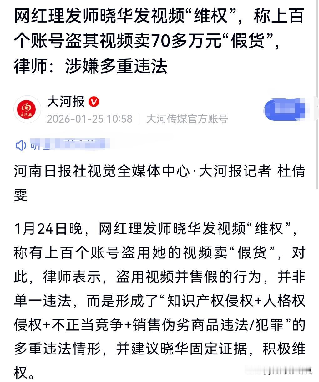 现在这年头违法犯罪的人员实在是太多了,特别是涉嫌经济犯罪的。 1月25日热搜。 网红理发师晓华发视频“维权”。 说了上百个账号盗她他的视频卖假货,卖了好几十万。 这确实是不地道啊,是一种侵权行为呀。 那肯定是支持这个网红来维权的,要是人人都这样盗视频卖假货的话,那不乱套了吗? 社会需要较真和维权的人。