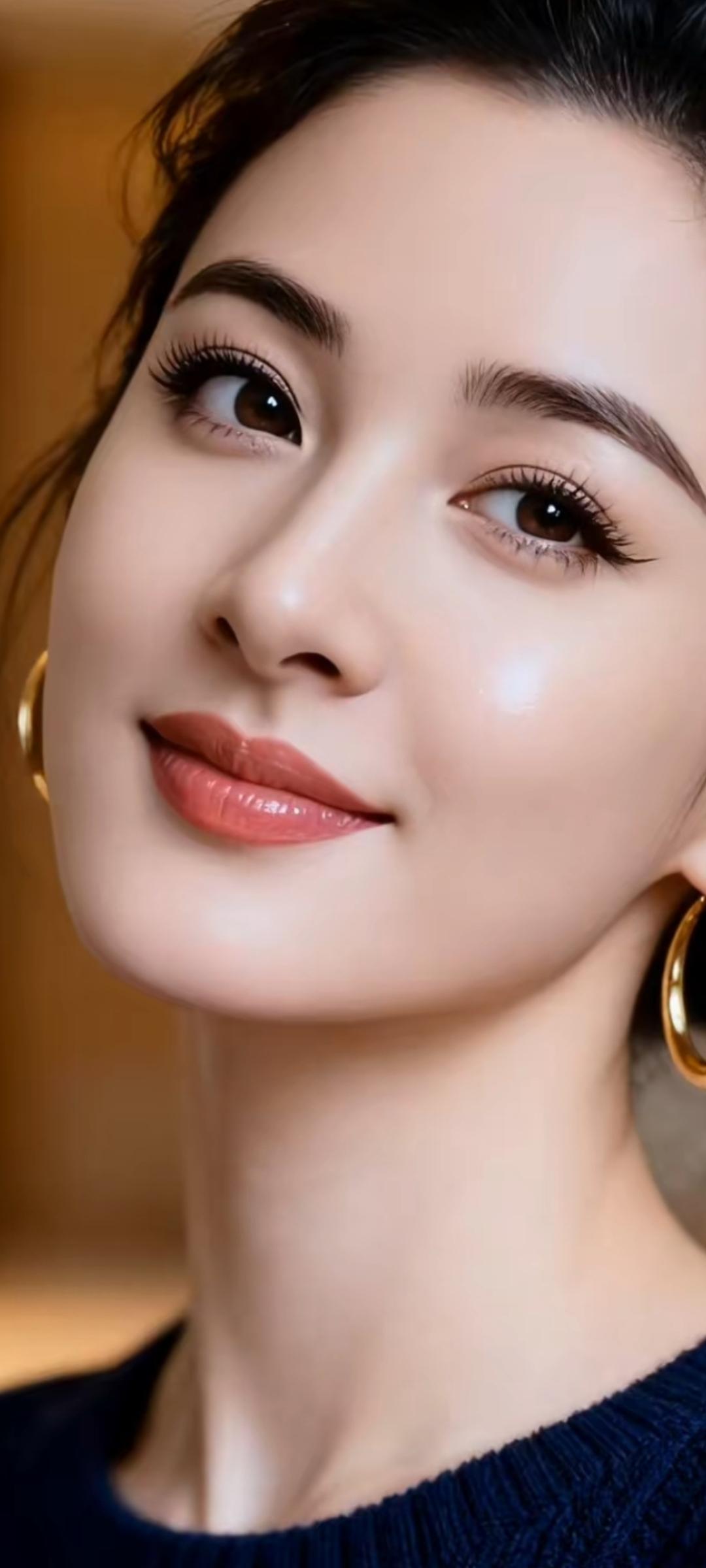 温柔甜美的微笑,金色的耳环,优雅的气质。