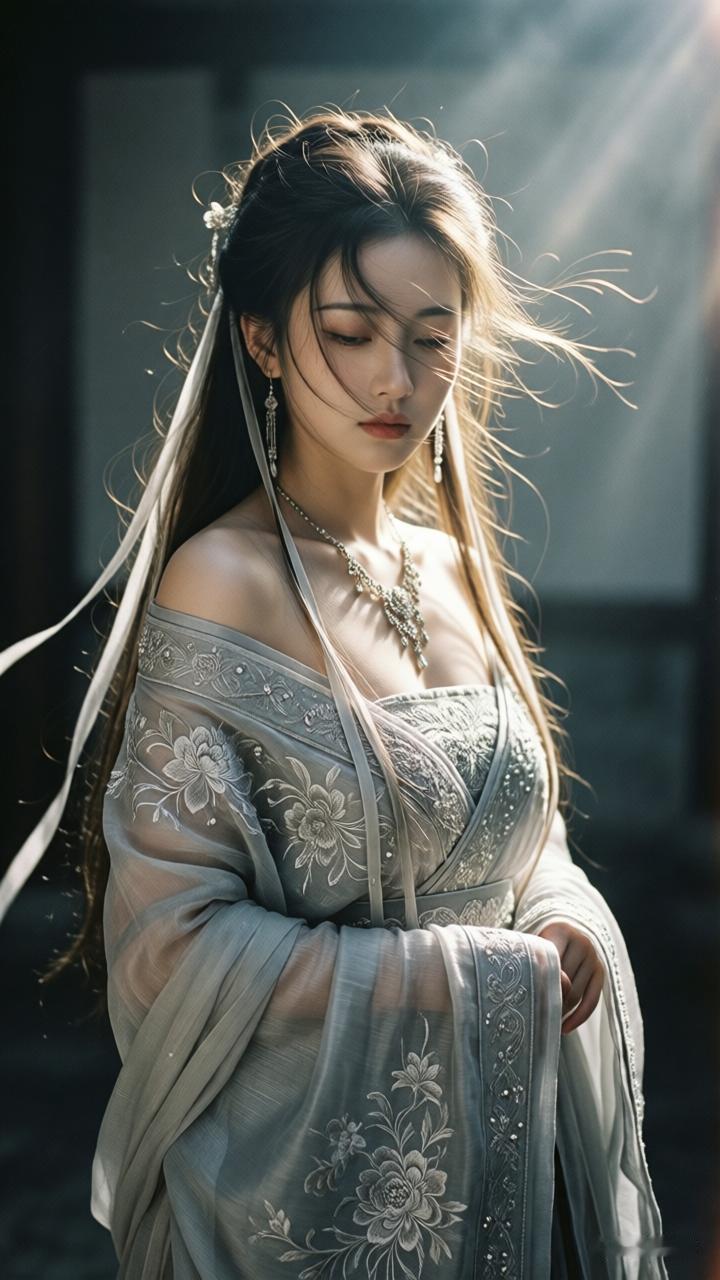 梦幻古风少女,轻盈纱裙,精致银饰,宛如画中仙子。