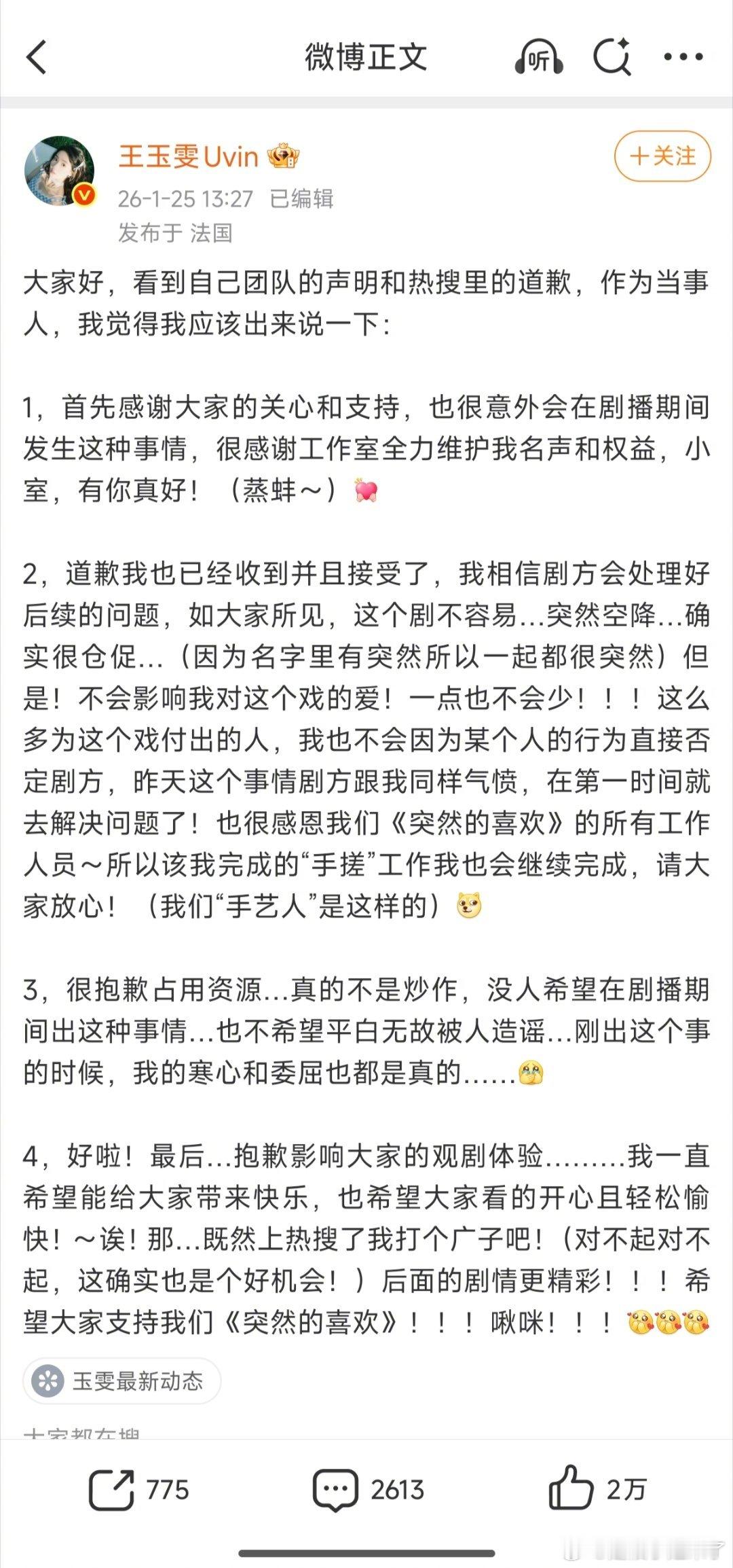王玉雯说寒心和委屈都是真的这也是剧宣的一环吗,不是炒作自己私下解决不就可以了。。给我观感反正是不太好,主要是本来说的事情也没人知道是什么,属于连战场在哪儿都没见过就自己走完了一整套流程王玉雯方停止突然的喜欢一切宣传工作