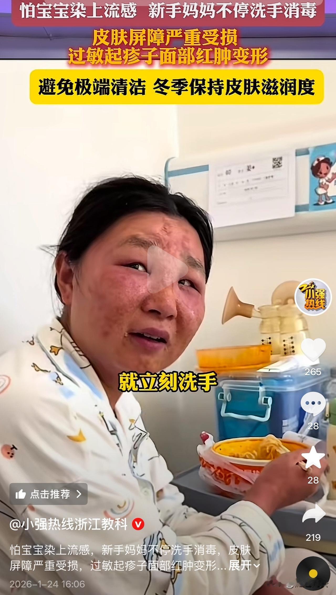 万事应该有个度!江苏一新手妈妈担心流感传染给宝宝,每天频繁洗手消毒,结果导致自己面部红肿变形。 该女子是新晋宝妈,非常担心病毒传给宝宝,但凡她接触了不是婴儿用品,立刻洗手消毒,还不敢用护肤品。 没想到她的双手全脸,乃至全身都起了疹子,脸红肿变形,她的老公迅速把她送到医院就医,所幸是因过度清洁导致的,并非是其他大病。 目前,她的病已经好转。 很多新手宝妈都会有过度清洁的毛病,生怕孩子接触病毒会生病,对他们过度保护。 其实,这样并不好,人生活在这个世界里,不可能不接触病毒,这也是身体自我增强的环节。 农村小孩从小就在地上挖土滚爬,但是他们的身体就是比城里人强壮。 更可况上了幼儿园会刷病毒库,难道你要保护他,不让他上吗? 朋友们,你们说对吗?