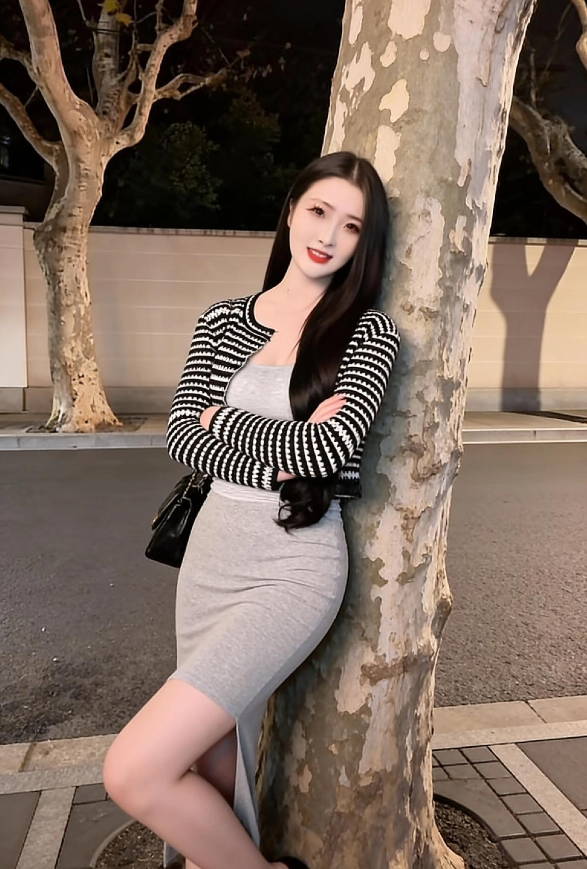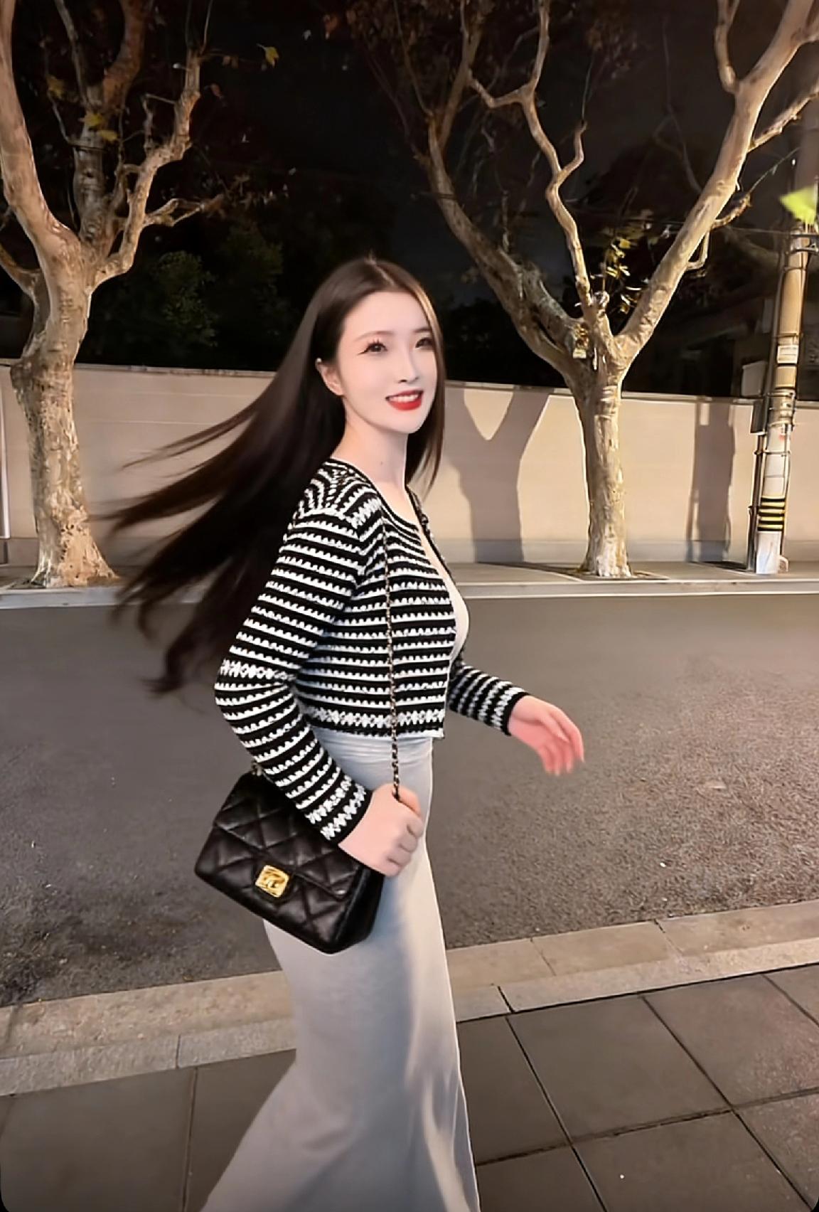 夜晚街头的优雅时光,黑白色调与长裙的完美搭配。
