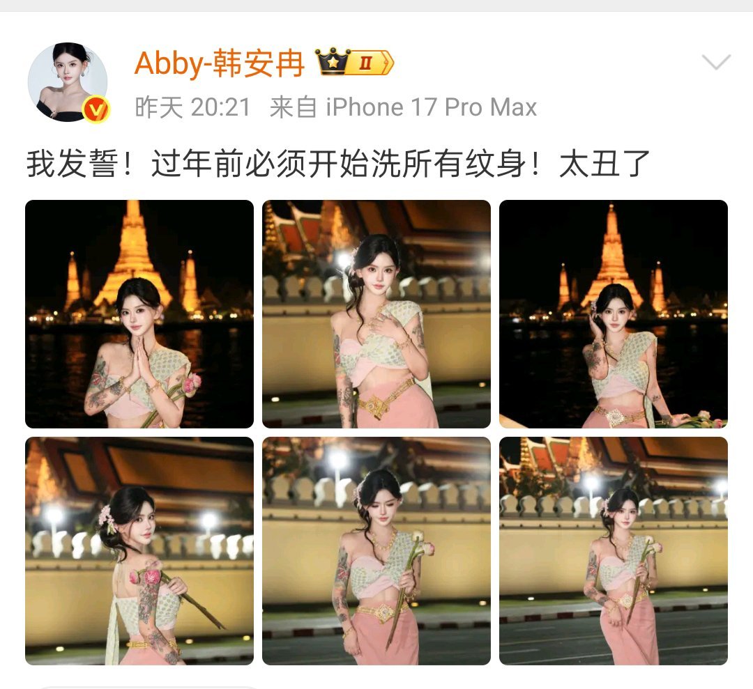 韩安冉自曝今年洗掉所有纹身我记得韩安冉满胳膊都是啊!我只想默默说一句,不疼吗...这是什么新的博取流量的手段吗