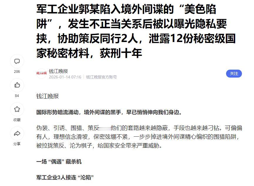 央视曝光军工重大泄密:间谍使用了美人计,1月14号央视新闻对外曝光了,一则军工企业的泄密事件。 一个姓郭的军工企业的经理,在前往某国验收某项项目的时候,被安排与一个所谓的女性商务代表见了面。随后,郭某没有能够顶住美色的诱惑犯了错误。错误发生之后,对方马上表明身份,并且以曝光隐私来威胁郭某,要求对方为国外谍报组织服务。 郭某作为军工企业项目经理,赴某国验收项目时,被伪装成"商务代表"的女性精准接触。 这场看似寻常的社交邂逅,实则是经过数月研判的定向围猎——对方早已掌握其行程轨迹、职务权限,甚至个人生活细节。 当郭某在异国他乡放松警惕时,美色陷阱迅速突破了他的心理防线,私密视频成为要挟的把柄,最终将其拖入叛国深渊。 这类案件的可怕之处,在于"温水煮青蛙"的渗透逻辑。境外组织从不急于求成,而是先以行业交流为幌子建立信任。 据国家安全部门统计,近年破获的军工泄密案中,73%的涉案人员与间谍接触超过6个月,最长达3年。 郭某案中,所谓的"商务代表"全程使用合法身份,在公务场合自然切入技术话题,逐步降低其戒备。 这种伪装的"专业性",让涉密人员误以为是正常业务往来,直到陷入桃色陷阱才惊觉中计。 军工领域成为重灾区,源于其特殊的信息价值。 根据《武器装备科研生产单位保密资质管理办法》,一级资质单位可接触绝密级信息,而项目经理这类中层管理者,往往同时掌握技术参数、项目进度、人员架构等多维情报。 郭某的权限不仅能获取图纸资料,更能通过日常管理掌握团队分工——这些看似普通的"边角料",一旦被境外分析,足以推断出某型装备的研发方向。 正如某泄密案中,境外机构仅凭会议纪要里的设备采购清单,就还原出新型导弹的制导系统参数。 涉密人员的"身份红利",恰恰成了被围猎的软肋。 郭某案发后,调查显示其手机里存着23个境外社交账号,其中7个标注"行业资源"。 这种"资源积累"的错觉,让他忽视了《保密法》第二十四条关于"境外人员接触审批"的规定。 更值得警惕的是,境外组织擅长利用"社交货币"——郭某收受的所谓"纪念品",实则是装有窃听器的定制钢笔;参加的"商务晚宴",座位安排经过精密测算,确保其能"偶然"遇见特定人士。 这些细节,远超传统保密培训的覆盖范围。 单位管理的"流程空转",为渗透打开了缺口。根据军工保密资质要求,出国人员必须接受行前审查、每日报平安、归国复盘。 但郭某的行程表显示,其境外期间有3次未报备的单独外出,同行人员竟未察觉异常。 这种"重审批轻监管"的现象并非个案——某航天企业泄密案中,涉密人员连续17次在境外与间谍会面,单位却因"怕影响项目进度"未启动核查。 制度执行的弹性,让保密协议成了一纸空文。 案件更深层的警示,在于人性弱点与制度漏洞的交织。郭某并非不知保密条例,但其在境外独处时的心理脆弱,被间谍组织精准捕捉。 国家安全机关的心理画像显示,60%的涉密人员在境外易产生孤独感,45%对"被认可"有强烈需求。 这种人性缺口,被境外组织包装成"知音难求"的假象——正如郭某在笔录中写道:"她懂我的压力,不像单位只会讲保密条款。" 这种情感裹挟,让刚性的制度约束在特定场景下失效。 泄密的连锁反应远超想象。郭某团伙提供的12份秘密级文件,看似级别不高,却包含某新型雷达的测试周期、参与人员名单。 境外机构据此逆向推导,不仅破解了技术参数,更锁定了3名核心工程师进行挖角。 这种"情报涟漪"效应,正是《反间谍法》将"为境外刺探情报"单独入罪的原因。数据显示,一起中级泄密案的修复成本,平均需要8年研发时间和2.3亿元资金。 面对升级的渗透手段,防范体系必须从"被动堵漏洞"转向"主动织密网"。 某军工集团的经验值得借鉴:为涉密人员配备智能手环,自动屏蔽境外偷拍设备;建立"社交白名单",出国期间自动阻断陌生号码联系;甚至在内部系统嵌入AI预警,当某类文件被高频次查阅时自动触发审计。 这些技术手段,正在填补"人盯人"的管理盲区。 郭某案不是孤例。从2023年张某泄露导弹制导技术,到2025年卫某出卖网络安全数据,军工领域的泄密案呈现鲜明共性: 涉案人员平均年龄38岁,正值事业上升期;泄密动机70%与"情感/尊严胁迫"相关;85%的案件存在境外社交软件高频使用记录。 这些特征,勾勒出境外组织"打感情牌、抓小辫子、造紧迫感"的完整套路。 当我们谈论国家安全时,不应只看到边境线上的哨所,更要关注写字楼里的键盘、会议室的水杯、甚至异国他乡的一杯咖啡。 郭某们的教训证明,保密防线最薄弱的环节,永远是人。唯有将制度刚性、技术韧性、教育柔性三者结合,才能让境外谍影无机可乘。