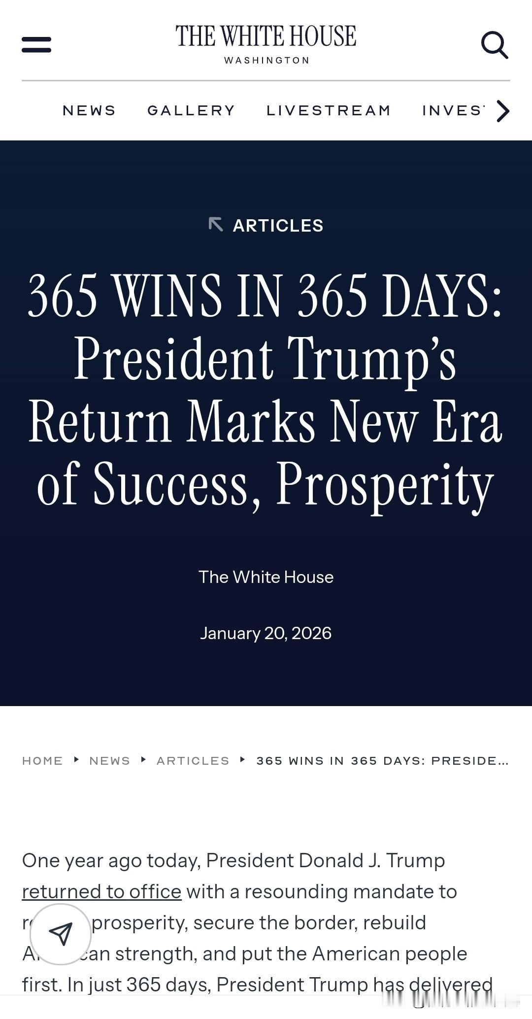 2026年1月20日,美国总统特朗普出席了白宫记者会,发表了关于自己就职一周年的讲话,并回应了外界关心的一些热点问题,包括格陵兰岛的争议等。特朗普手持一叠厚厚的文件走进白宫简报室,他豪言自己重返白宫的第一年,取得的成就堪称史无前例,比历届政府的努力都要多得多,甚至一个星期都列不完。 根据美联社的报道,记者们在会前收到了一份长达31页的材料,列举了特朗普政府自认为的365天内365项胜利。 此事于白宫官网亦有记载。 “365 WINS IN 365 DAYS!” “MAGA!”