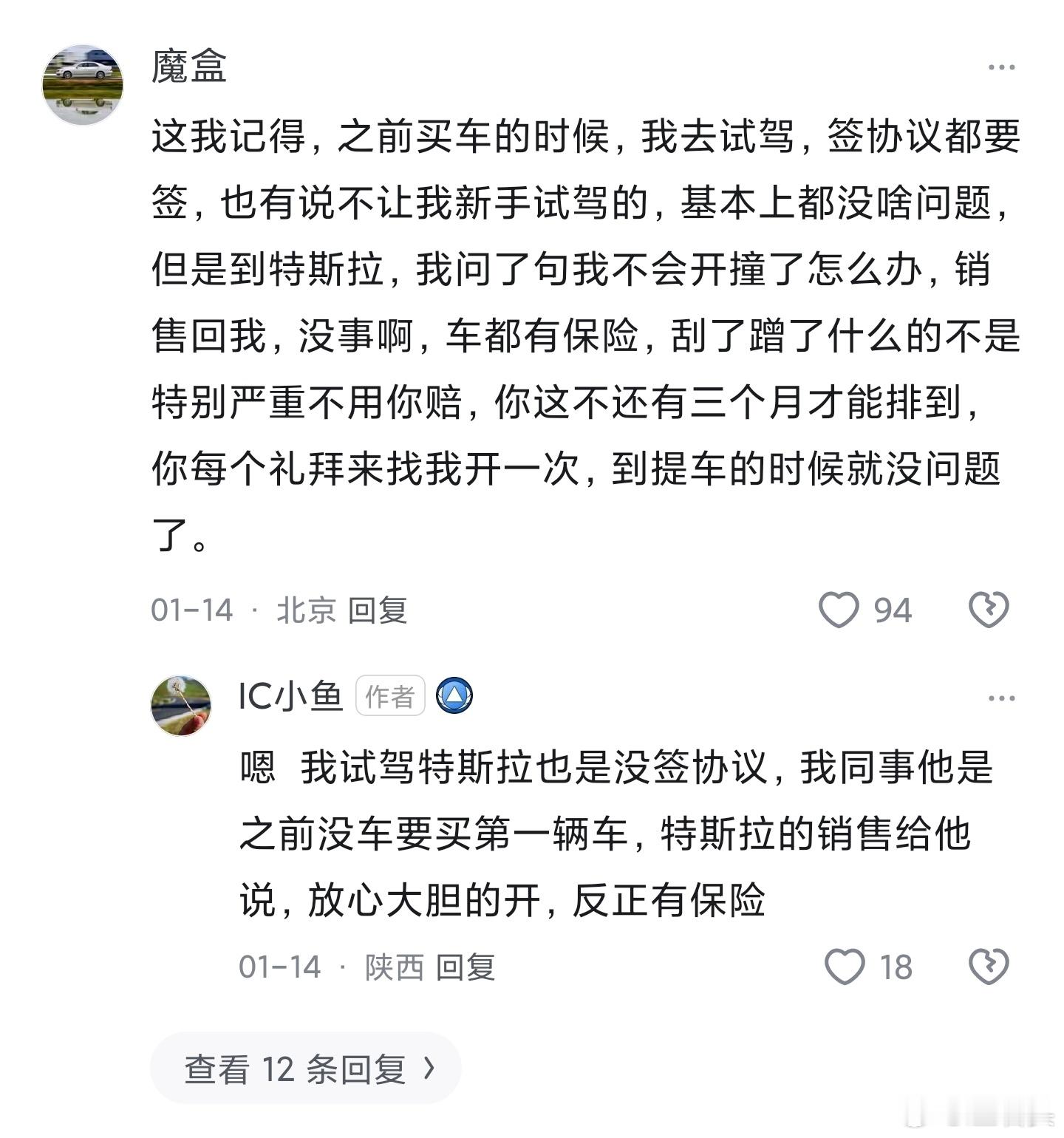 看到一条吐槽,说是去某品牌试驾,销售让签试驾协议,担心刚拿驾照就来试驾,出去撞死几个人他们赔不起。。。这位网友听到干脆不试驾了,销售挽留建议试试,网友说协议太不合理了,开自己车都有保险兜底。然后销售来了句:“咱今天是必须出这个事故吗?”这个品牌还是对销售加强一下培训吧,这话术换谁都会跑吧。。。看评论区其他网友分享,小米、特斯拉都没有这样的要求,三者都是买够1000万,撞到劳斯莱斯了都不要客户赔。