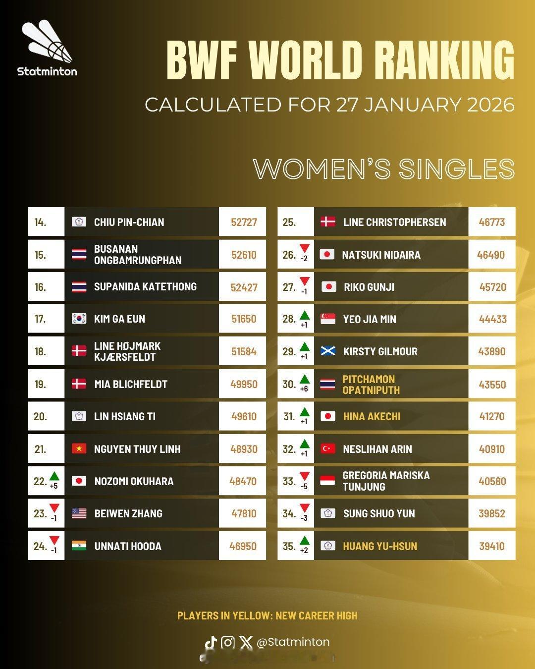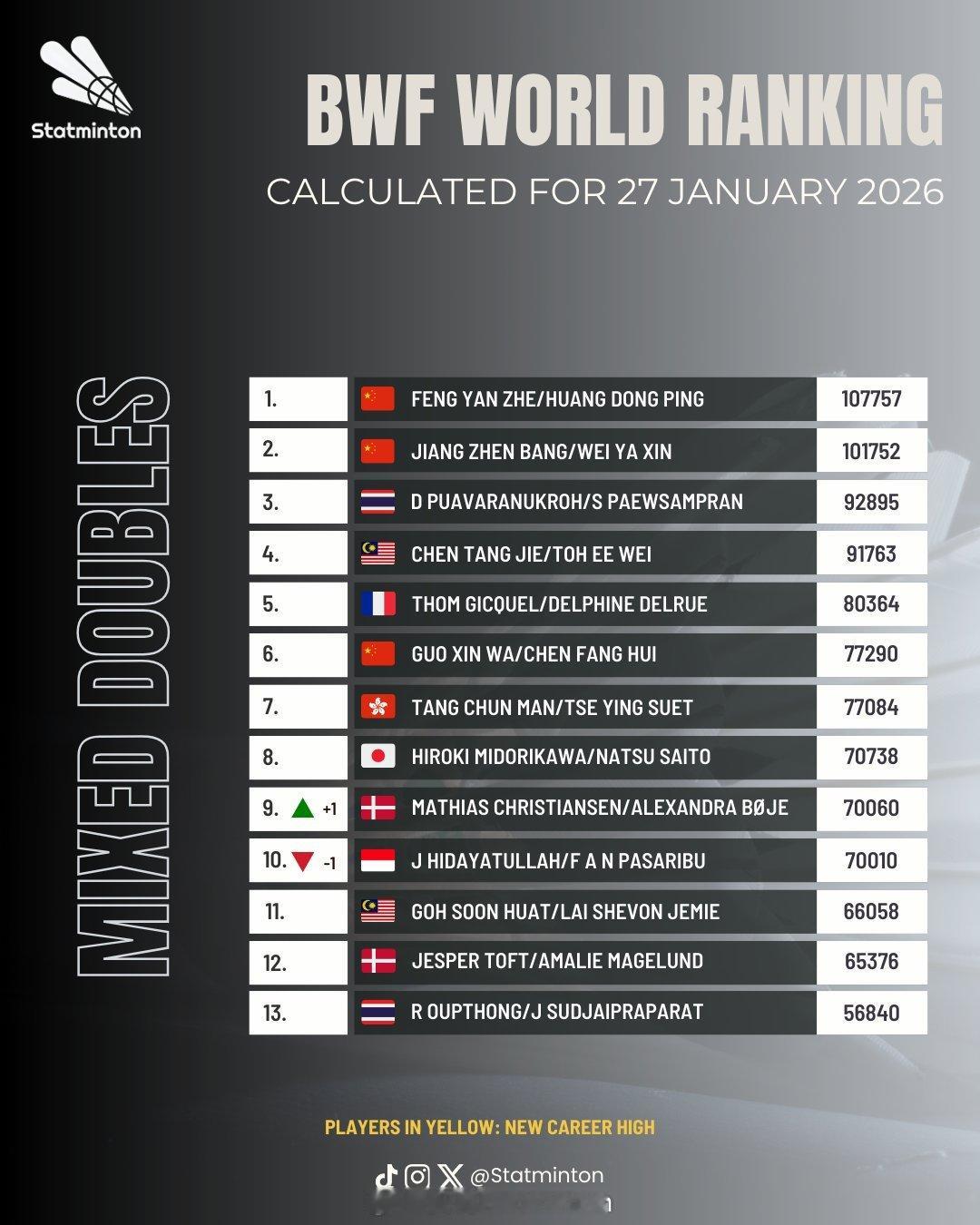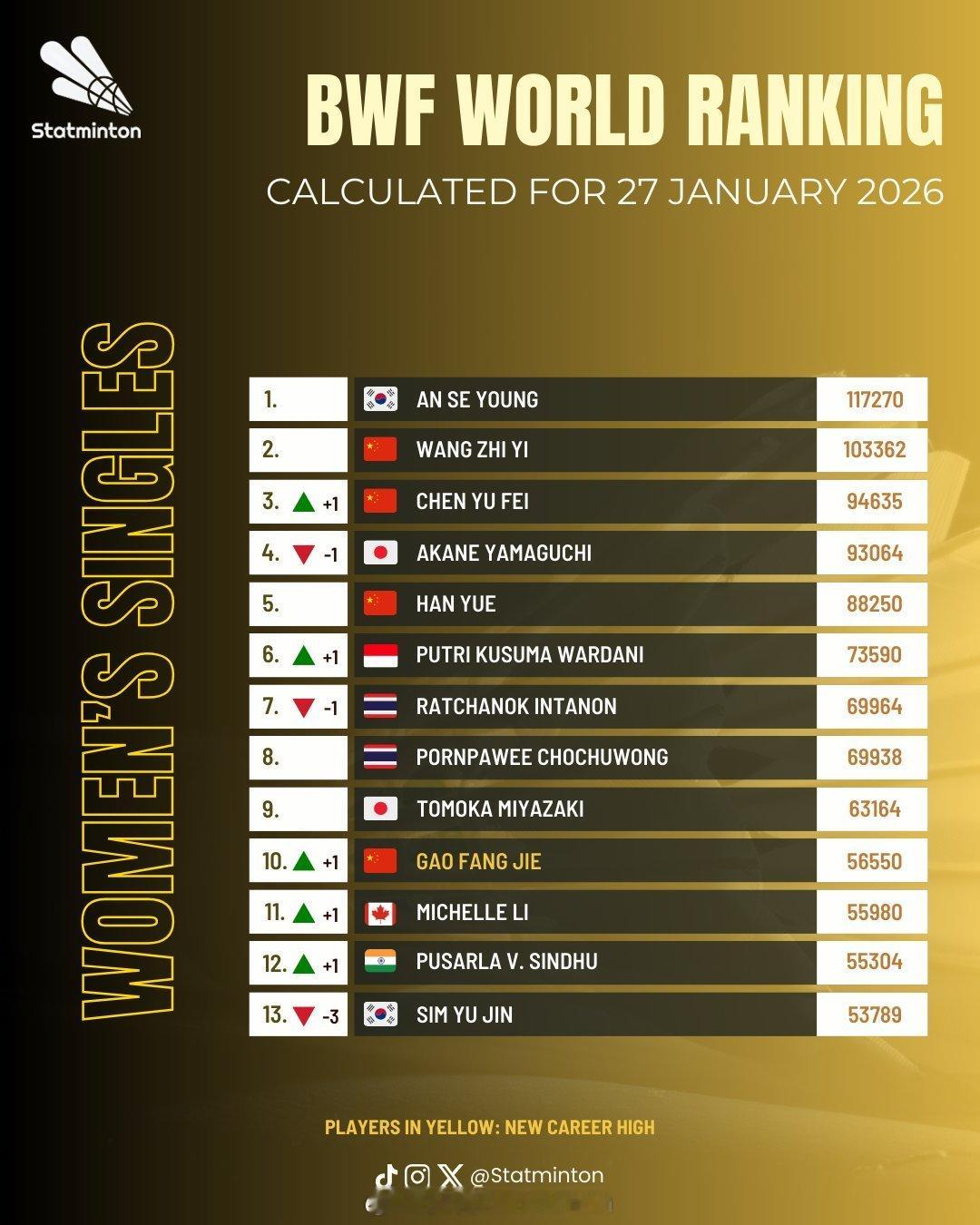 🏸羽毛球各单项最新世界排名🔝🌟男单【图1 图2】:石宇奇❶、李诗沣❺、翁泓阳15、陆光祖18、王正行24🌟女单【图3 图4】:王祉怡❷、陈雨菲❸、韩悦❺、高昉洁❿(⭐创新高)🌟男双【图5 图6】:梁伟铿/王昶❸、陈柏阳/刘毅12、黄荻/刘阳27🌟女双【图7 图8】:刘圣书/谭宁❶、贾一凡/张殊贤❹、李怡婧/罗徐敏❽、🌟混双【图9 图10】:冯彦哲/黄东萍❶、蒋振邦/魏雅欣❷、郭新娃/陈芳卉❻、程星/张驰16、高家炫/吴梦莹23🔝排名来源statminton,统计至前35名,图中标黄色字体为创排名新高,具体排名以每周二官方公布为准,仅供参考!陈雨菲印尼赛夺冠截止2026年印尼羽毛球大师赛