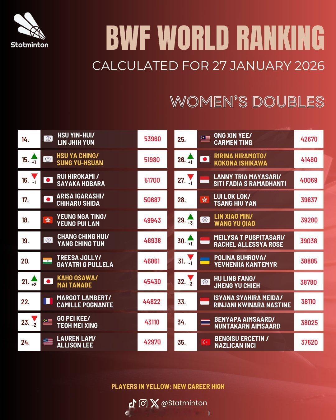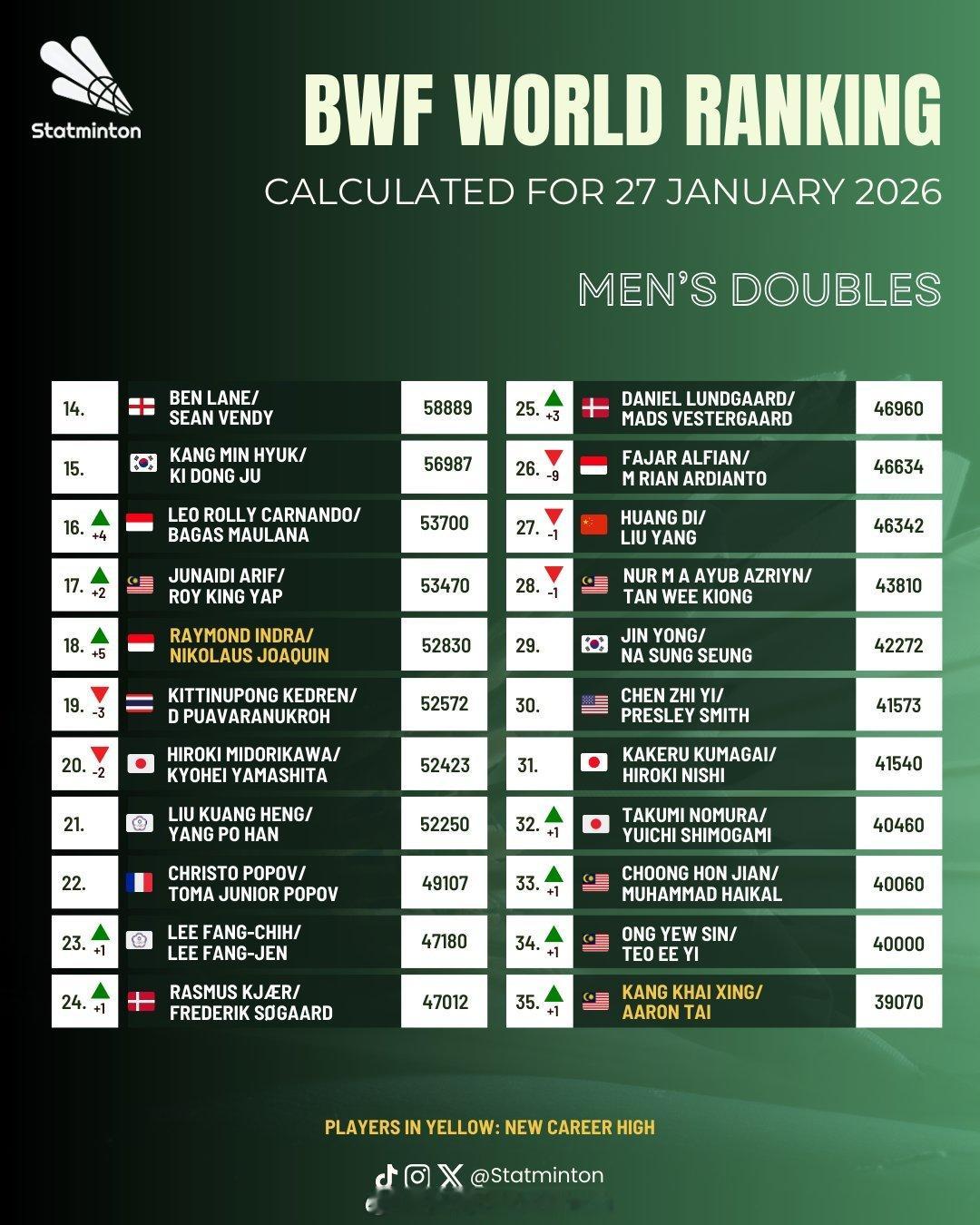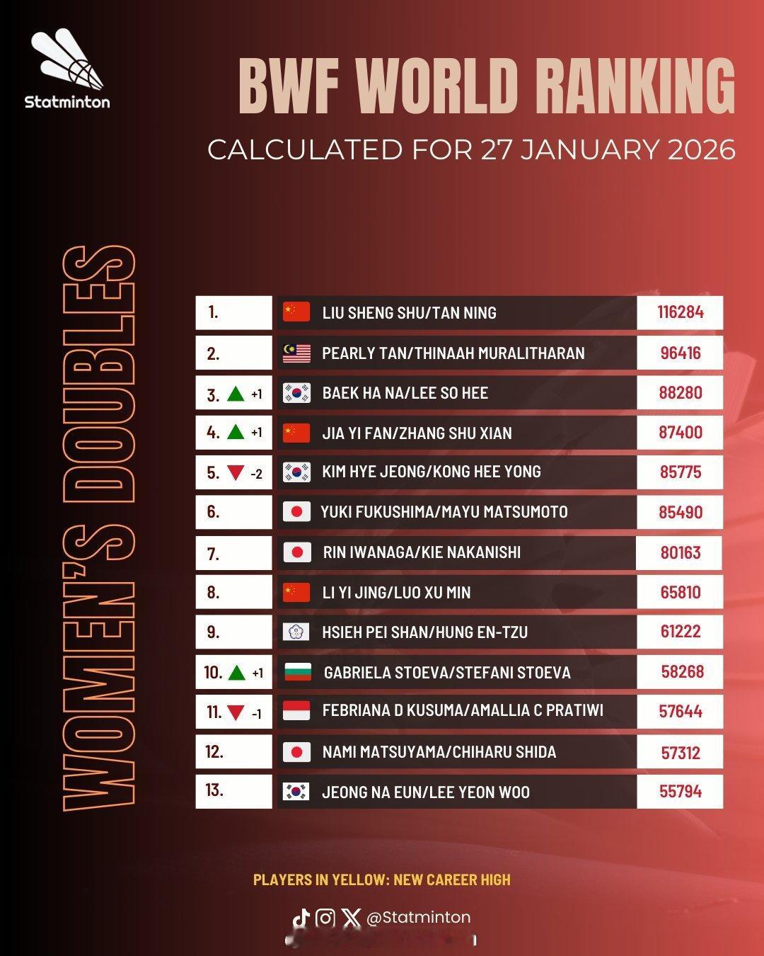 🏸羽毛球各单项最新世界排名🔝🌟男单【图1 图2】:石宇奇❶、李诗沣❺、翁泓阳15、陆光祖18、王正行24🌟女单【图3 图4】:王祉怡❷、陈雨菲❸、韩悦❺、高昉洁❿(⭐创新高)🌟男双【图5 图6】:梁伟铿/王昶❸、陈柏阳/刘毅12、黄荻/刘阳27🌟女双【图7 图8】:刘圣书/谭宁❶、贾一凡/张殊贤❹、李怡婧/罗徐敏❽、🌟混双【图9 图10】:冯彦哲/黄东萍❶、蒋振邦/魏雅欣❷、郭新娃/陈芳卉❻、程星/张驰16、高家炫/吴梦莹23🔝排名来源statminton,统计至前35名,图中标黄色字体为创排名新高,具体排名以每周二官方公布为准,仅供参考!陈雨菲印尼赛夺冠截止2026年印尼羽毛球大师赛