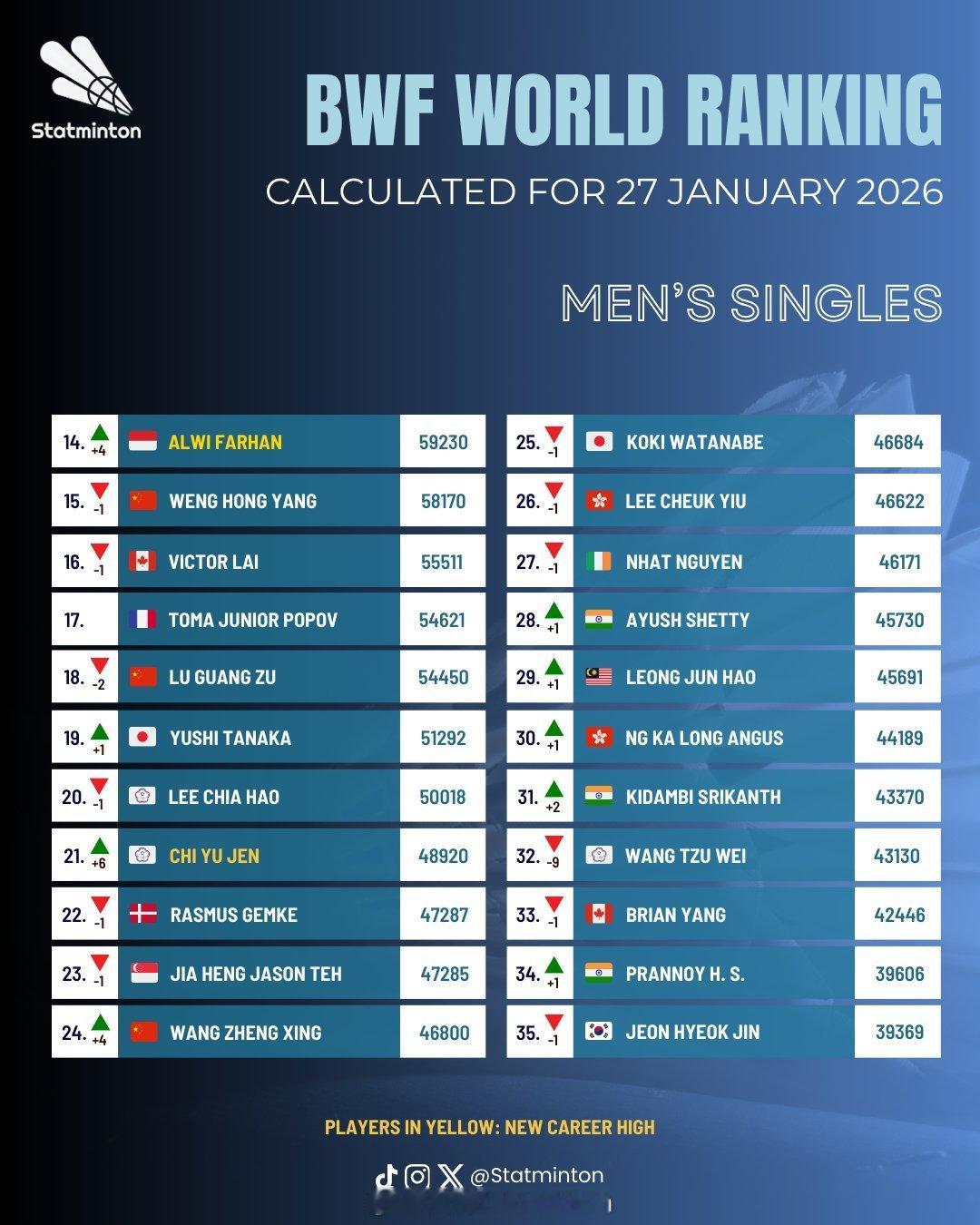 🏸羽毛球各单项最新世界排名🔝🌟男单【图1图2】:石宇奇❶、李诗沣❺、翁泓
