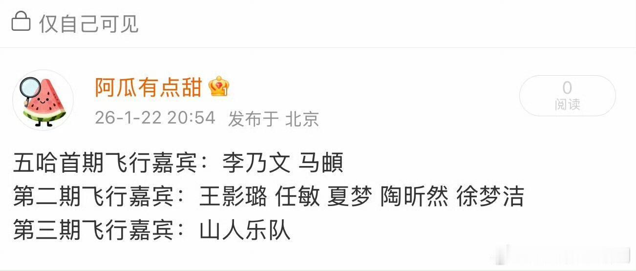 五哈李乃文1-3期都在 五哈首期飞行嘉宾:李乃文 马頔第二期飞行嘉宾:王影璐 任敏 夏梦 陶昕然 徐梦洁第三期飞行嘉宾:山人乐队五哈‖哈哈哈哈哈