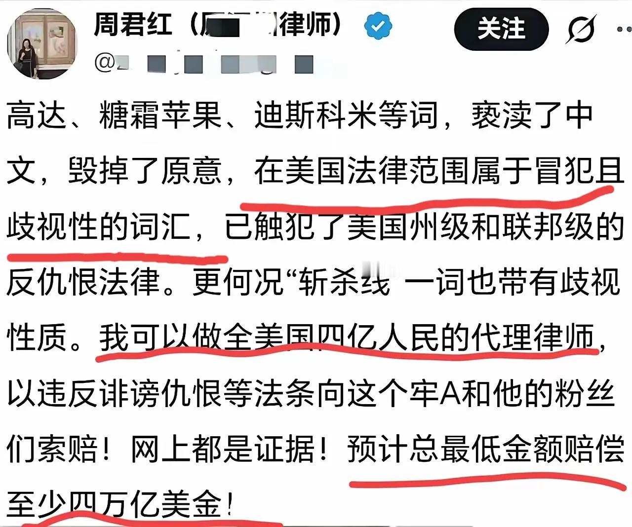 被反华“大殖子”周君红这波操作给逗乐了 还真把自己当大律师了?还放话称“斩杀线”带有歧视意味,要当美国4亿人的代理律师,向牢A和粉丝索赔四万亿美金! 咱就说这格局也太小了,直接索赔40万亿美刀多痛快,反手把美国国债清了,你直接成为美利坚的大英雄,美爹不得把你供起来好好供奉着? 三通一达都没让她有啥反应,牢A一个斩杀线直接让她跳脚破防,这“殖子”的玻璃心也太易碎了! 更让人迷惑的是,她舔美表忠心,居然不用英文喊话,偏偏用中文叫嚷,合着是专门演给国内人看的?是怕美爹看不懂,还是就这点本事? 想起这货早就被吊销律师证,被美爹弃如敝履还硬要去舔,真真是跳梁小丑一个!这种反华“殖子”滚出国内,着实是天大的好事,能少多少让人膈应的糟心事🙄