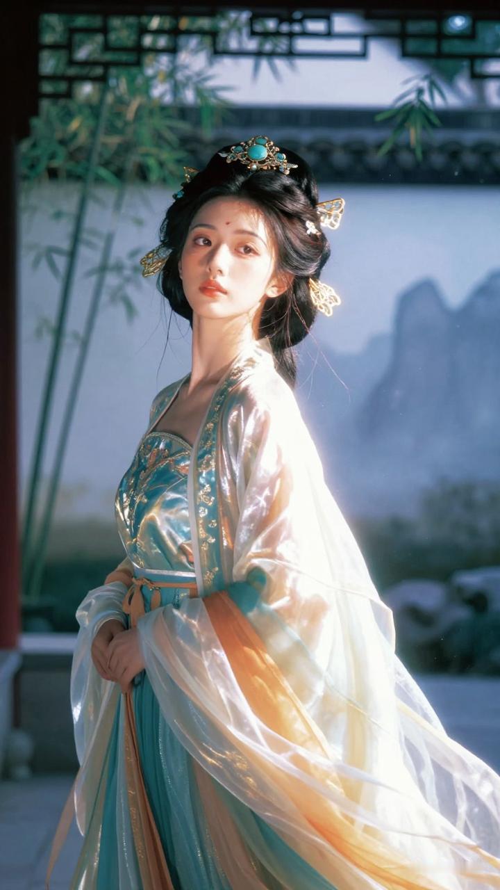 梦幻古风少女,轻盈纱裙,精致银饰,宛如画中仙子。