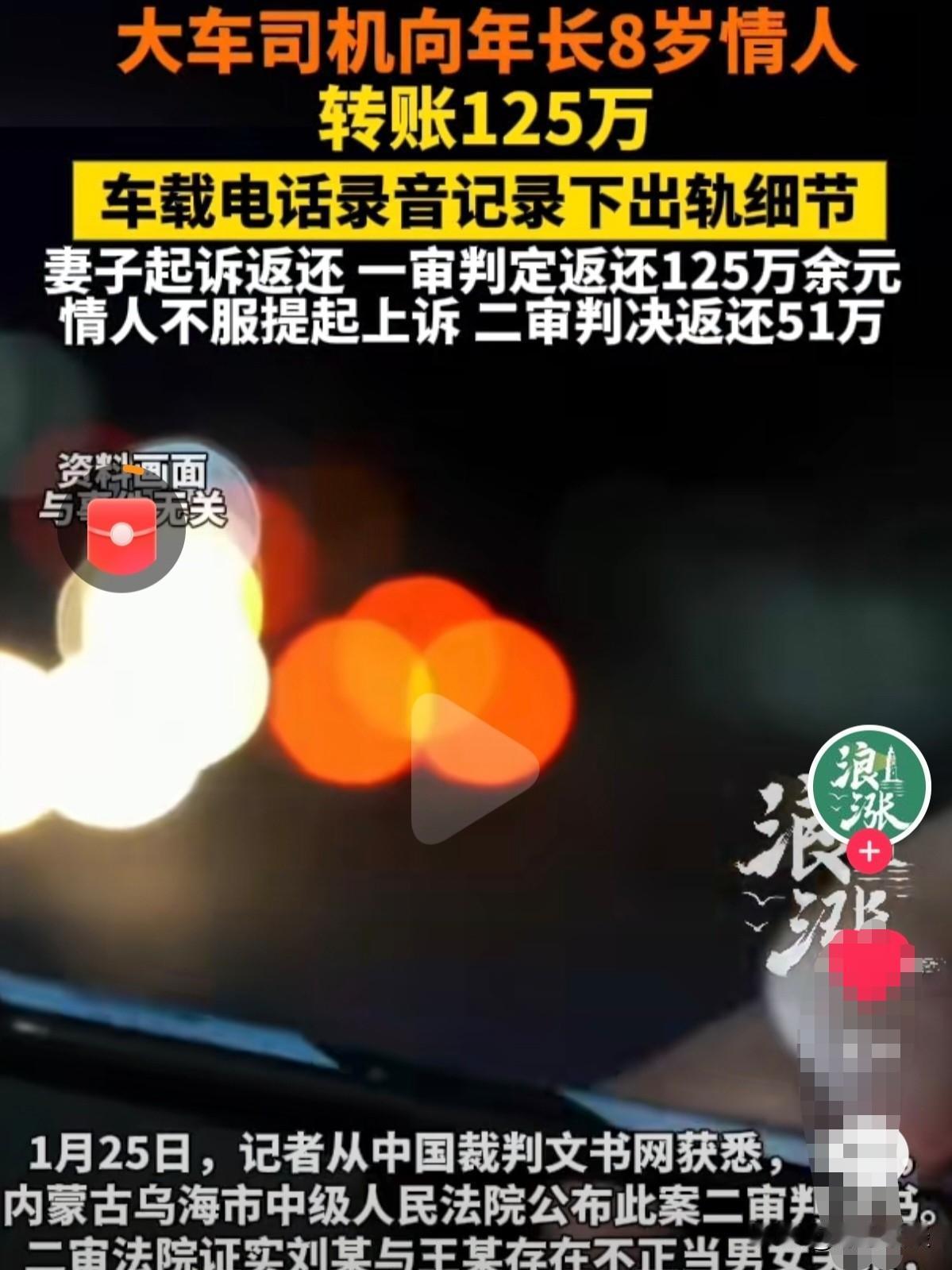 内蒙古乌海,一位大货车司机,常年跑长途,耐不住寂寞,背着妻女,在外面养了个大8岁的情 人,一瞒就是十几年。妻子偶然通过车载电话,听见丈夫亲昵地喊对方“傻老婆”,这桩外情才彻底败露。东窗事发后,司机怕家散了,给妻子写下保证书,承诺痛改前非,回归家庭。妻子想为了家庭忍下这口气,可一番核查后,发现丈夫这些年给对方转账,竟高达125万余元!自己在家省着细着,他却对外面的女人挥金如土,这份委屈和愤怒,妻子实在咽不下。一纸诉状将第三者告上法庭,要求全额返还,没想到,二审给出不一样的看法! 49岁的王某是个大车司机,吃苦耐劳,一干就是20多年。 都说十个司机九个花,一个不花大酒包,看样子真不是空穴来风。 王某23岁结婚,女儿也长大成人,一家人虽然聚少离多,但母慈女孝,日子踏实安稳。 可王某愣是把十几年的夫妻情分抛到脑后,偷偷给比自己大8岁的情人转了125万,最后被妻子告上法庭。 王某常年跑长途,路上寂寞就找了个情人,关键是比他大8岁,一好就是十几年。 家里的妻子省吃俭用,守着孩子过紧日子,压根没发现丈夫的猫腻。 直到有一次,妻子用车载电话联系丈夫,电话那头居然传来丈夫亲昵喊别人“傻老婆”的声音。 这一下可把妻子伤的不轻,20几年的枕边人,竟然早就背叛了自己。 王某没想过离婚,只想着家里红旗不倒,外面彩旗飘飘。 2024年6月11日,王某怕家散了,各种压力没办法,给妻子写保证书。 王某心里跟明镜似的,自己背着妻女和刘某好十几年,这事心里有愧。 他亲口承认,跟刘某有不正当关系十几年,害苦了妻女,认识到自己的错误。 还保证以后跟刘某一刀两断,工资全交老婆,花一分钱都报备。 彻底洗心革面好好过日子,签完名就盼着妻子能原谅。 王某天真地以为,这丑事写张保证书就能翻篇。 妻子虽然生气,但想着为了孩子忍一忍,经营了这么多年的家庭,真是舍不得放弃。 可一查丈夫的银行转账记录,直接气炸了。 这十几年里,丈夫一笔笔、一次次给情人转钱,加起来足足有125万! 自己在家一分钱掰成两半花,舍不得买件新衣服、舍不得吃顿好的,丈夫却对外面的女人挥金如土,这换谁能咽得下这口气? 妻子没再忍,直接把第三者告上了法庭,要求全额返还125万。 一审法院根据保证书、车载电话录音,还有那些带特殊寓意的转账记录一一核查。 直接认定王某和刘某的不正当关系违背公序良俗,转账无效,判刘某10日内返还125万多和利息! 刘某不服,跳出来上诉狡辩:有74万是我信用卡刷给王某,他再转自己的。 结果二审一统计,还真有这回事,但剩下的51万多,实打实是夫妻共同财产! 证据摆得明明白白,保证书、暧昧转账、通话录音全对上了,二审直接判刘某返还51万多和利息! 跑大车挣钱是寂寞辛苦,但这绝不是出 轨的借口,背叛婚姻的人,早晚栽跟头。 擅自处分共同财产赠第三者,法律不认可,转账记录就是最硬证据! 省吃俭用守家,不如拿起法律武器,要回属于自己的财产底气! 婚姻里的忠诚不仅是道德要求,更是法律底线,谁要是敢跨越这条线,损害配偶的合法权益,法律绝不会答应! 对此,你怎么看呢?欢迎评论留言!