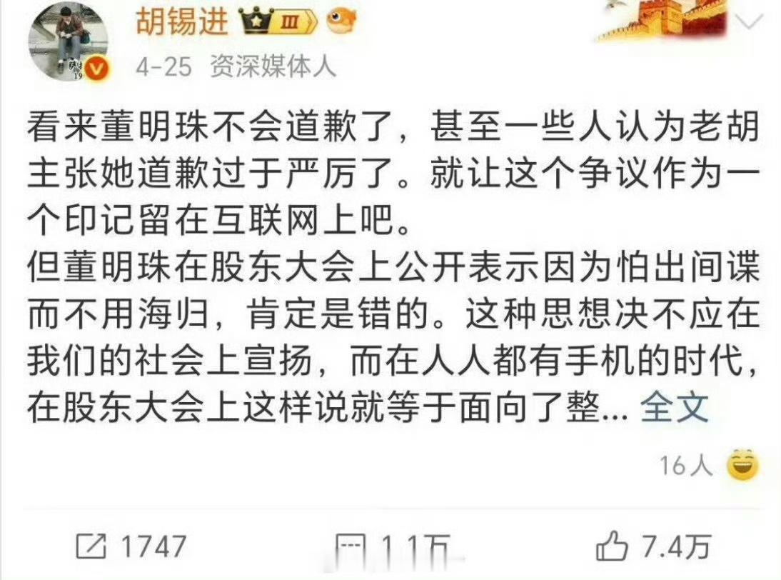 胡锡进文章根本不客观,都是随着热点事件及心情变化。因为牢A的言论,网友都想让胡锡进讲讲,毕竟他女儿也在国外工作学习过。而胡锡进沉默几天后,终于发文回应,讲事实,说道理,也算客观回复。但他的文章最后一句“尊重沉默权”让他又翻车了。当初董明珠公开场合表示不聘用海归,胡锡进连着发了很多文章批评董明珠,而且言语比较激烈。那么董明珠到底有没有享有沉默权,可以不说呢?看吧?胡锡进左右骑墙的特点一点都没有变,打败昨天胡锡进的是今天的胡锡进,关乎自己利益,口风聚变,差评!
