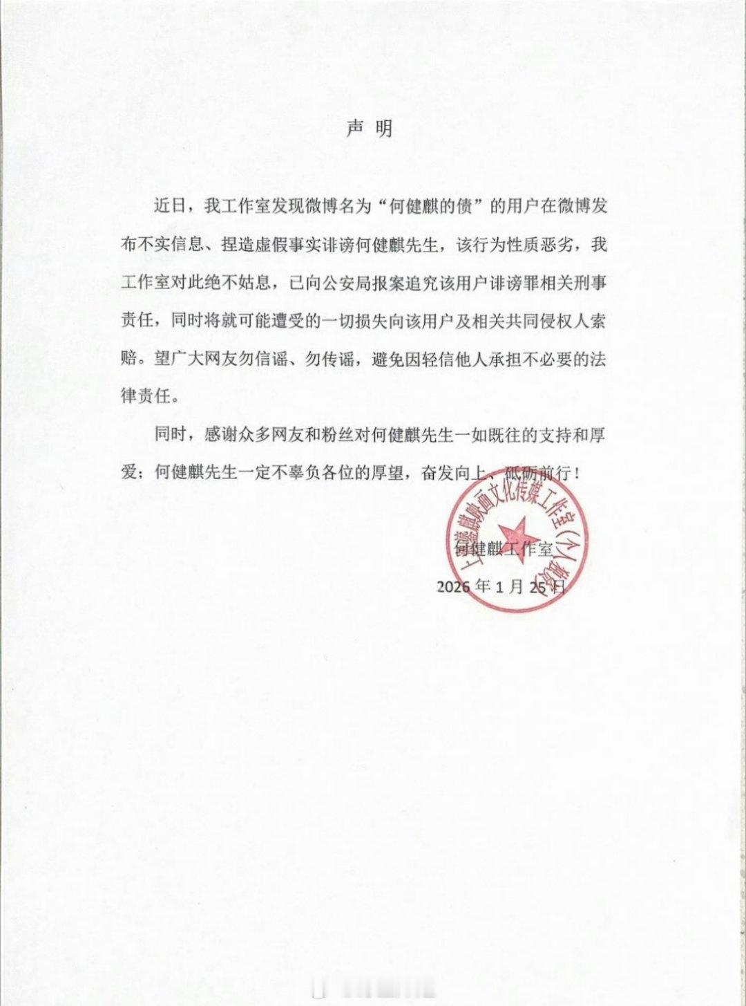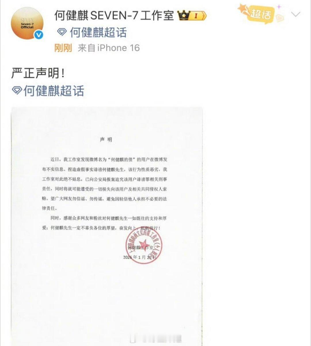 何健麒工作室出来发声明了,说发布的是不实消息、捏造虚拟事实诽谤何健麒,让网友勿信谣、传谣