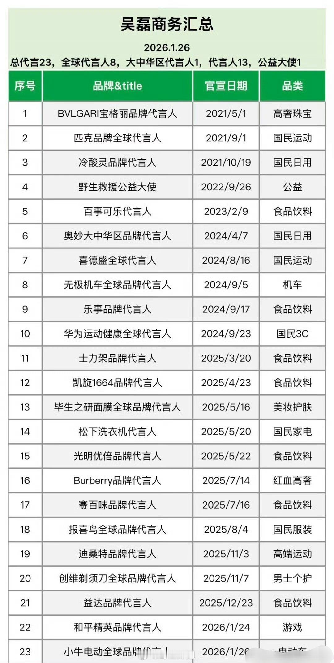 吴磊的商务汇总,最近也没有剧播,商务资源有23个,从童星出身的他,国民度就是比别人高啊 ,所以商务认可度也就水涨船高
