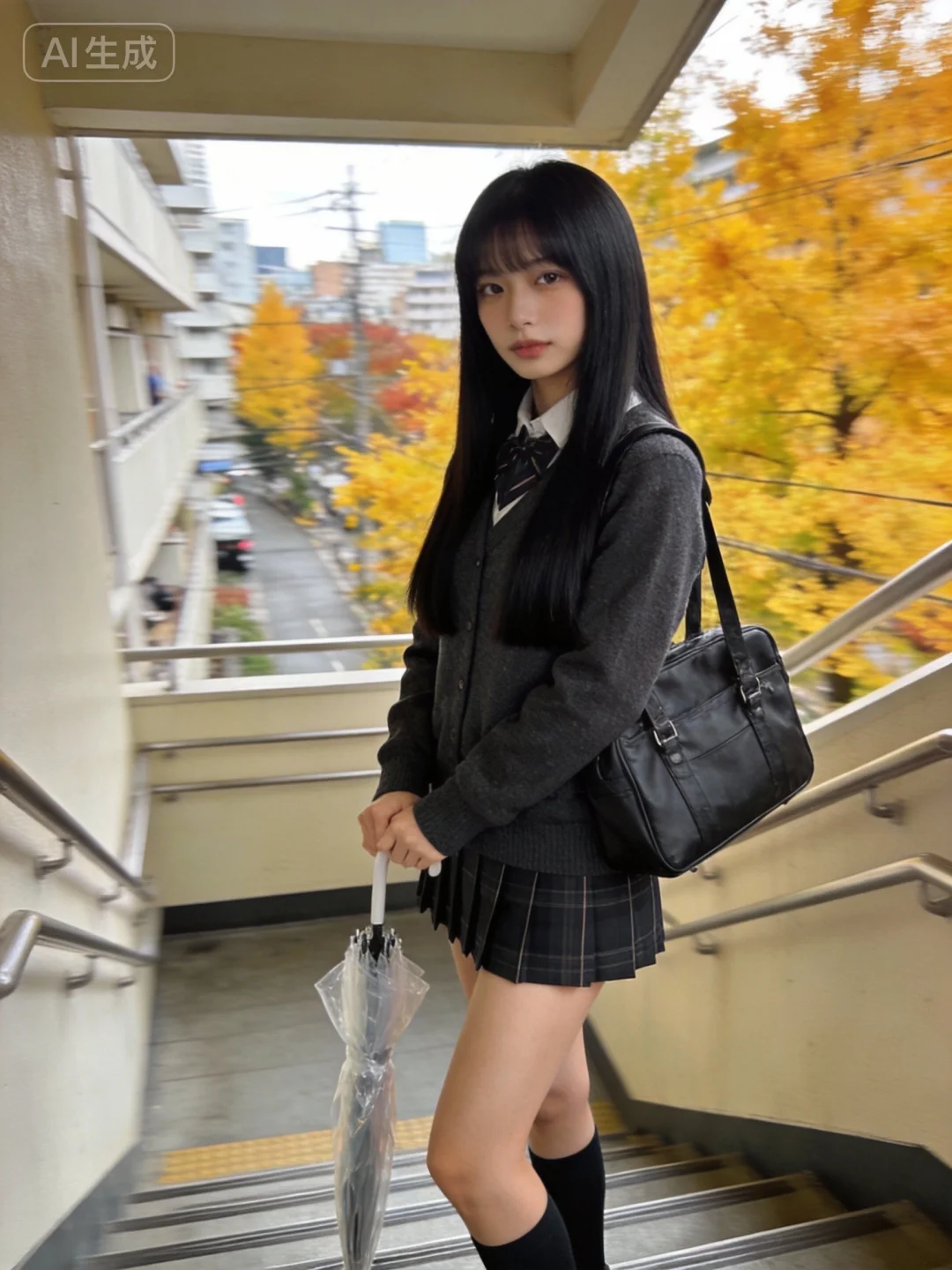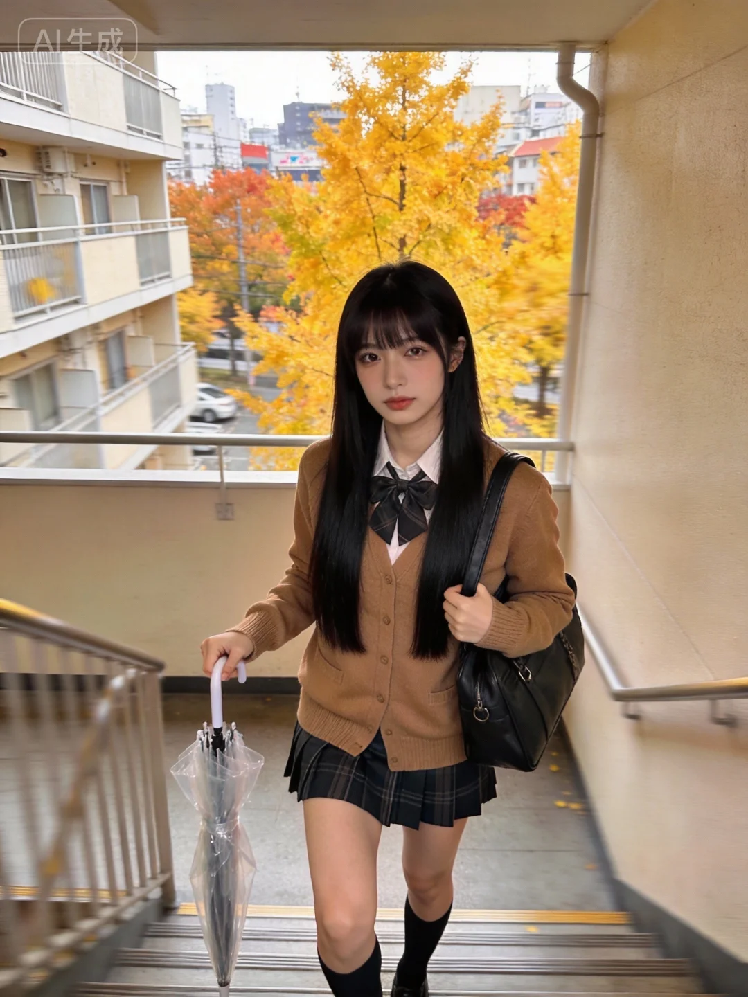 日常快照风格,随拍,手机拍摄照片,iPhone手机拍摄,一名18岁的亚洲女性,超高颜值美少女,聚焦上半身拍摄,五官立体饱满又精致,黑色顺滑长直发,长发从两颊自然垂下,发尾长度一致,身穿日式秋冬jk制服,双腿修长,完美比例,模特身材,肩挎日式制服包,手持一把收好的透明的雨伞,身处在日本公寓楼3楼左右的外层楼梯走廊,外面能看到日本秋天的城市风景,黄色的树叶