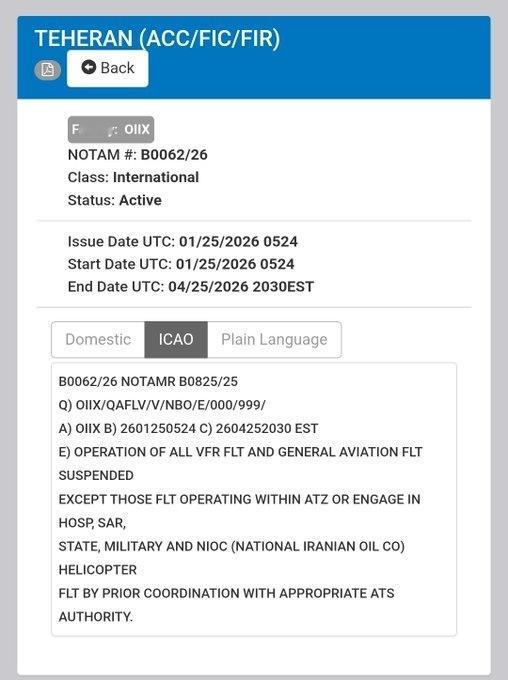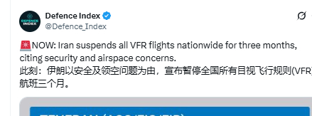 突发:伊朗以安全及领空问题为由,宣布暂停全国所有目视飞行规则(VFR)航班三个月。图二是航空通告,暂时没有其他媒体证实,伊朗可能对潜在的打击行动做提前准备!来源:Defence Index 伊朗军方警告随时准备扣动扳机 伊朗军方表示将捍卫国家利益 烽火问鼎计划