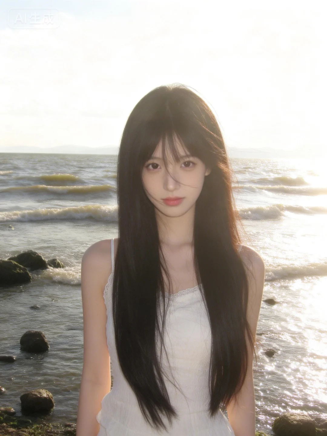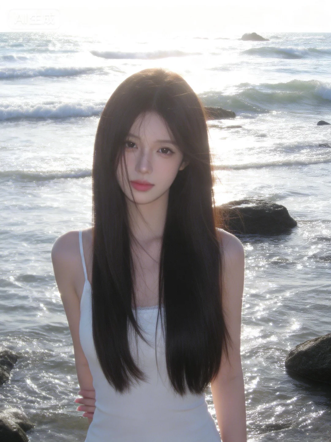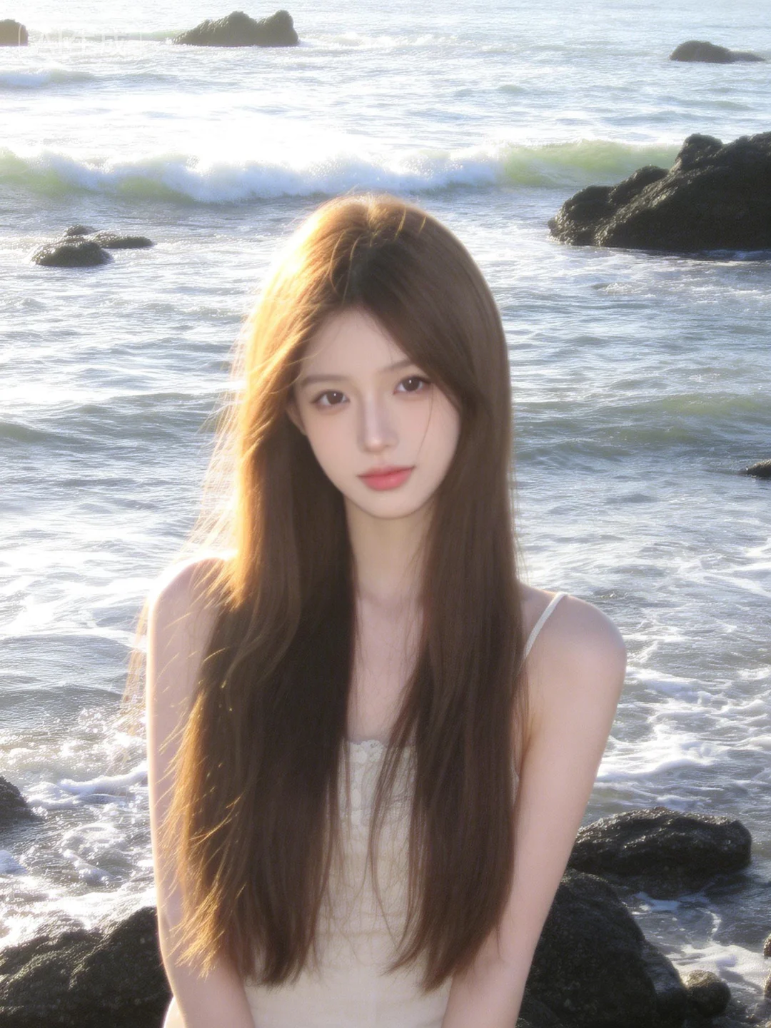 写实摄影风格(非商业修图),CCD拍摄质感,大师作品级氛围,保留轻微噪点,高光不过曝,阴影有细节;阳光透过发丝照在脸上以突出自然肌肤状态,随意抓拍构图(无刻意构图感),呈现生活中绚丽日常的贴近写实感;画面因快门速度不足产生轻微运动模糊,存在轻微阳光不均导致的过曝;主体为20岁高颜值气质女生,长发及腰、模样似洋娃娃般可爱,高鼻梁、瘦身材瘦脸型;女生表情自然松弛慵懒,眼神自然不失真(可看镜头或不看镜头),整体神态灵动又不失随性,尽显慵懒悠闲状态;整体为唯美的氛围感情绪片,无清晰主体,似非常普通的iPhone拍摄视角,远景正面人像凸显海浪,摆着pose,海边,海浪,暗礁。