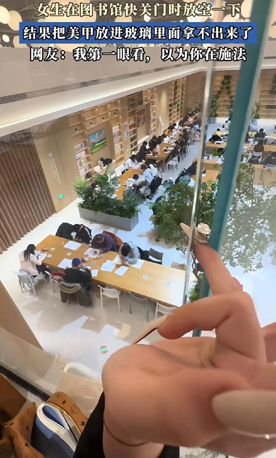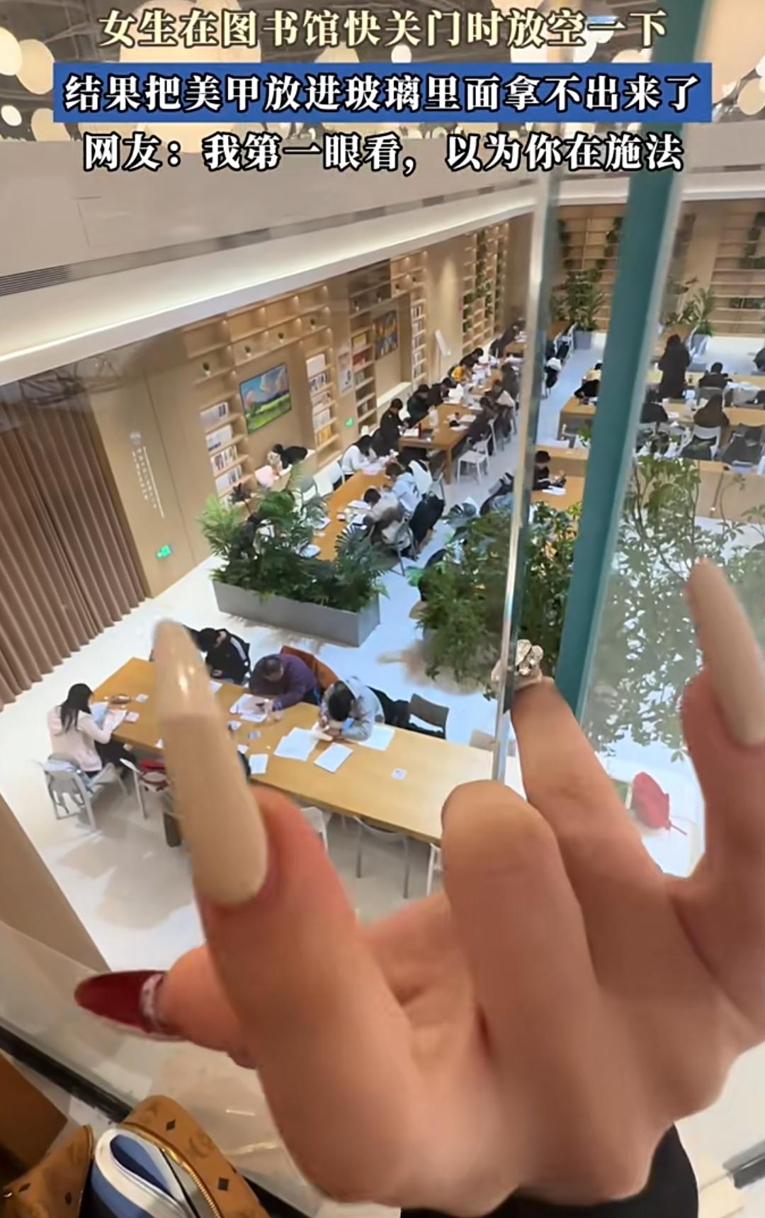 可能是我偏见,这女生成绩应该不是很好。就这花里胡哨的美甲,竟然出自一个学生之手。 你说她不认真学习吧,她来图书馆学习,一直待到快关门时。 你说她认真学习吧,她竟然有心思把自己手指头放玻璃里面,然后拿不出来了。 这是想显摆自己手指纤细,能够塞玻璃缝隙里?还塞带钻的无名指,这是炫耀自己的美甲吗?没想到意外翻车,拿不出来了。不用想,最后肯定又是消防员来帮忙了。 这智商,学习成绩能好到哪里去?当然,人家可能陪人学习的,毕竟去图书馆不一定是学习,对吧?