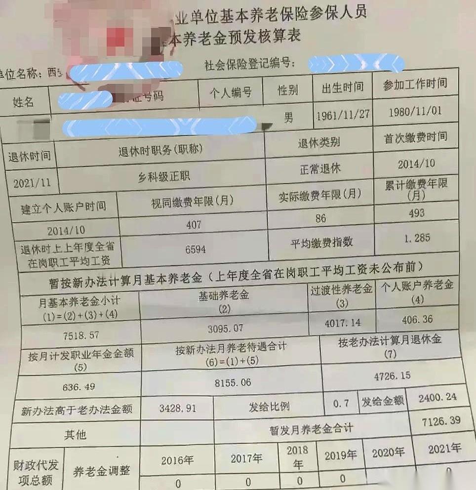 7126块一个月。 一个干了41年的乡科级干部,退休了,拿到手的就是这个数。坐标,陕西。 我看到这张单子的时候,说实话,心里咯噔一下。 从1980年干到2021年,整整41年,从青葱少年到两鬓斑白,一辈子就耗在一个地方,最后换来这么个数字。 很多人都觉得体制内的养老金是个谜,一堆公式看得人头大。 其实扒开那些复杂的算法,内核就那几样东西,简单粗暴。 说白了,他为什么能拿这么多? 第一,工龄长得吓人。41年,这辈子基本就交代在这儿了,这是基石,别人没法比。 第二,平时交得多。他的缴费指数是1.285,啥意思?就是他的工资单,一直都比社会平均水平要高,交钱的时候就比别人狠。 第三,职务。这玩意儿是硬通货,直接挂钩待遇。 最有意思的是啥? 按“老办法”算,他只能拿4700多。 可按“新办法”一算,嘿,能蹦到8100多! 最后咋办?国家也没让你全占,也没让你吃亏,取了个中间值,按比例给你,最后到手7126块。 很多人看到这个数字,第一反应是羡慕。 确实,在陕西这个地方,一个月7000多的退休金,日子可以过得相当舒坦了。 但你再想想。 一个人最好的41年,每天上班下班,开会写材料,人情世故,迎来送往。外面世界翻天覆地,他可能就在那个院子里,看着同一片天。 这7000多块,买断的是一个人的青春和锐气,换来的是一个家的安稳和一份晚年的体面。 这笔账,到底值不值? 每个人心里,恐怕都有一杆不一样的秤。