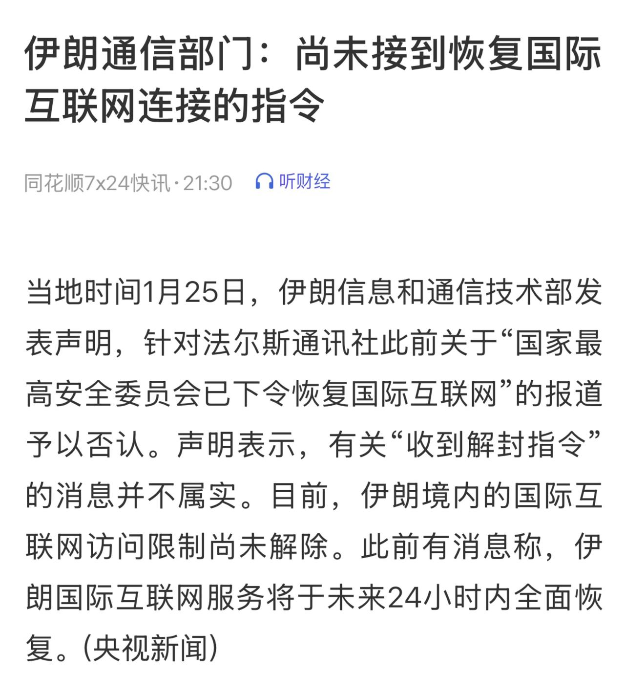 伊朗互联网服务恢复进展时间线(2026年1月) 1月12日:伊朗外长表示,互联网服务将在与安全部门协调后逐步恢复。 1月17日:有报道称伊朗全境已恢复互联网访问,实则为分阶段恢复计划,其最后阶段为国际互联网服务的重启。 1月18日:据凤凰网报道,伊朗互联网恢复将分三阶段推进,依次为短信功能、国内互联网及国际互联网。 1月20日:伊朗国家网络空间中心发言人透露,国际互联网服务已在逐步恢复过程中。 1月24日:伊朗法尔斯通讯社报道称,若技术进程顺利,所有省份的国际互联网将在24小时内全面恢复。 1月25日:伊朗信息和通信技术部发布声明,否认“已接到恢复国际互联网指令”,强调相关限制尚未解除。