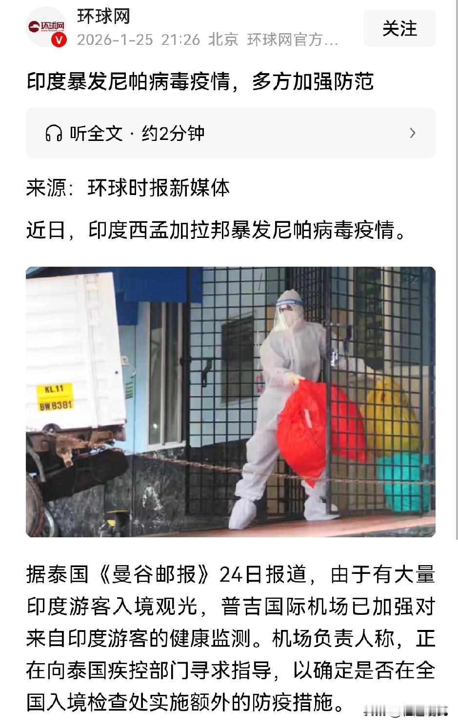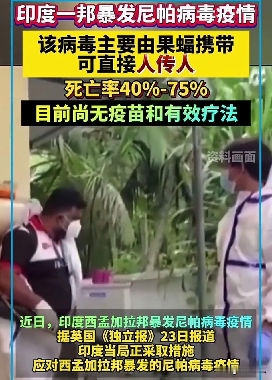 防疫部门和边境部门要特别注意了, 印度暴发致命的尼帕病毒疫情,死亡率在40%到75%之间,可以人与人,或人与动物之间互传,最最重要的是目前尚无专门的疫苗和有效治疗方法。 目前,泰国和尼泊尔已经收紧了对印度人入境的许可,因此,我们也必须要重视起来了,不能因为所谓的“引进人才”让这种疫情蔓延开来。