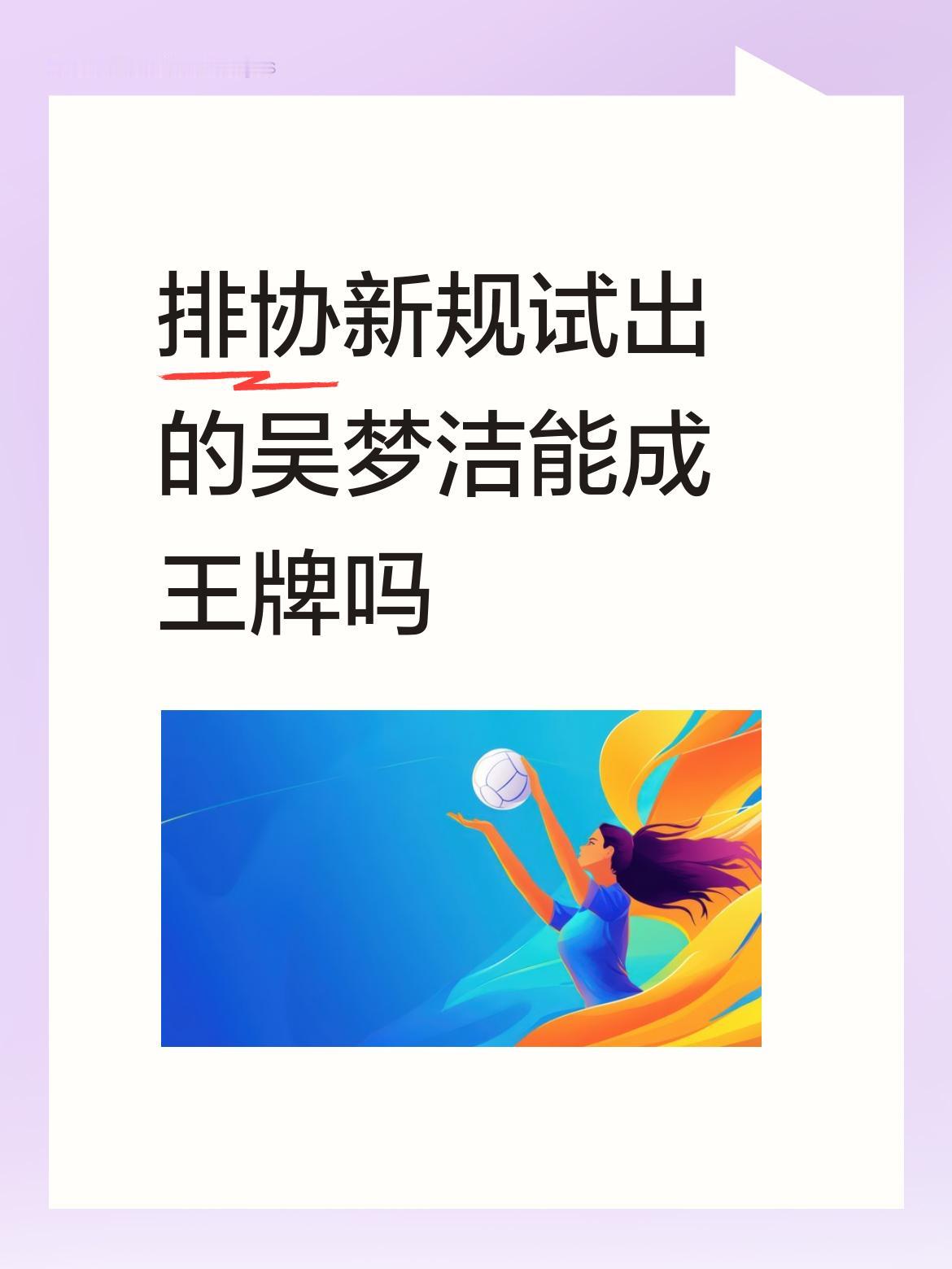 排协新规下,吴梦洁能否成王牌还真不好说。新赛季排协规定单外援上场,让本就亮点不多的联赛更沉闷。江苏女排全华班青年军是亮点,吴梦洁就在其中。她有机会在这样的环境中更多展示自己。 从世联赛看,教练会根据球员表现调整阵容。新奥运周期新人锻炼机会多,吴梦洁若能抓住机会,在赛场上证明自己的进攻、一传和防守能力,就有成为王牌的可能。不过,成为王牌可不是一蹴而就,得持续稳定发挥。未来如何,就看吴梦洁能否在新规下脱颖而出了。