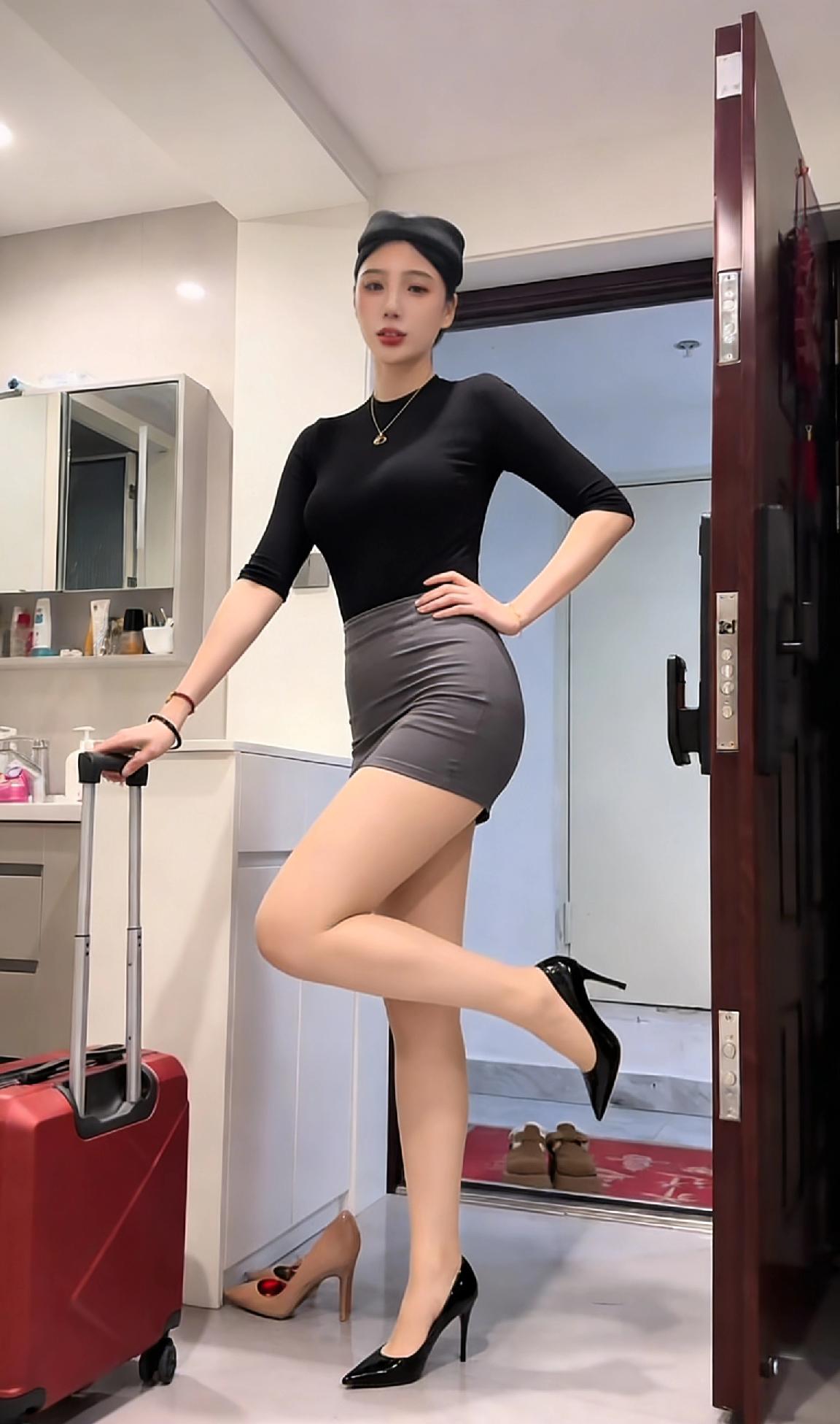 黑色上衣+灰色短裙,搭配高跟鞋,优雅出街!