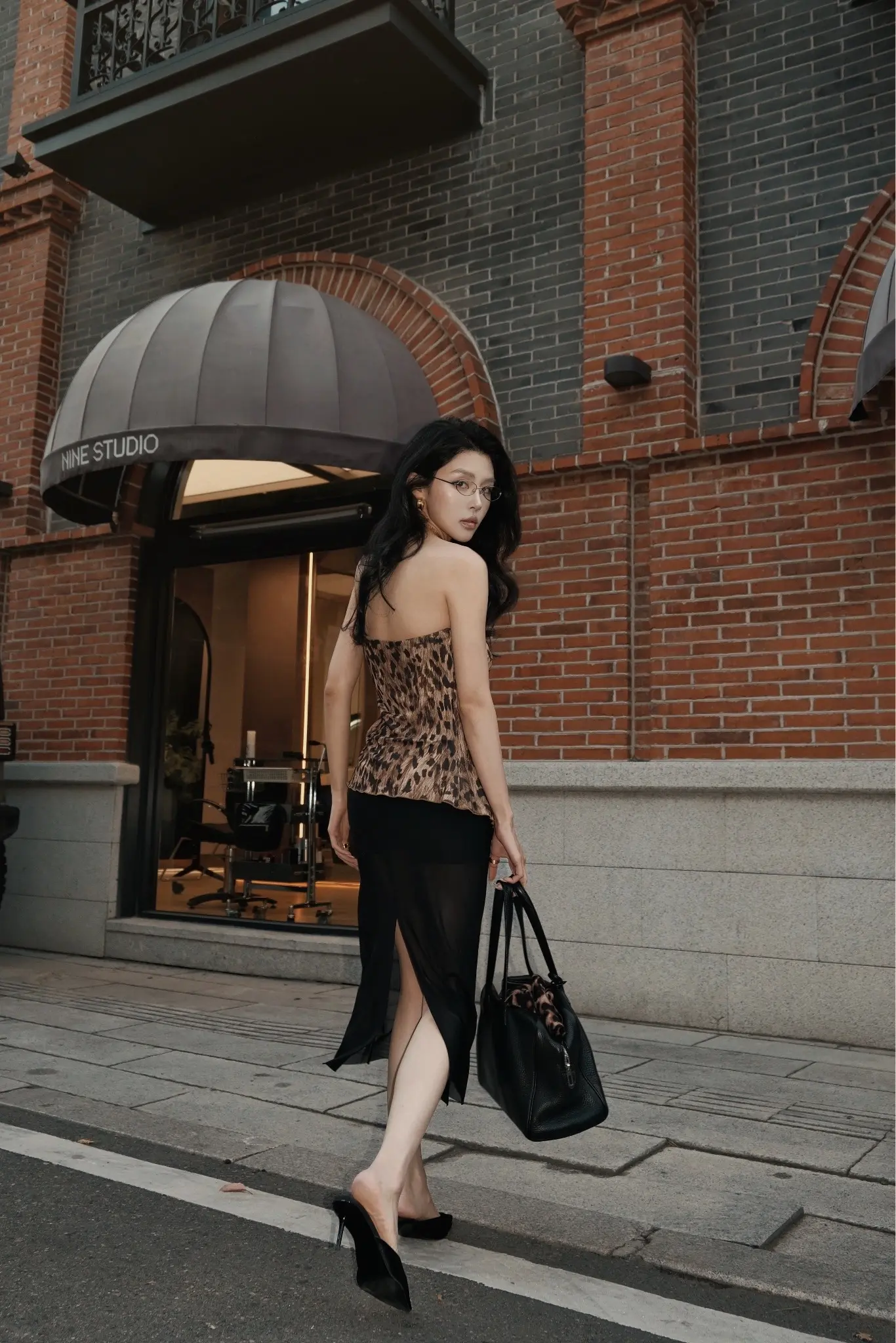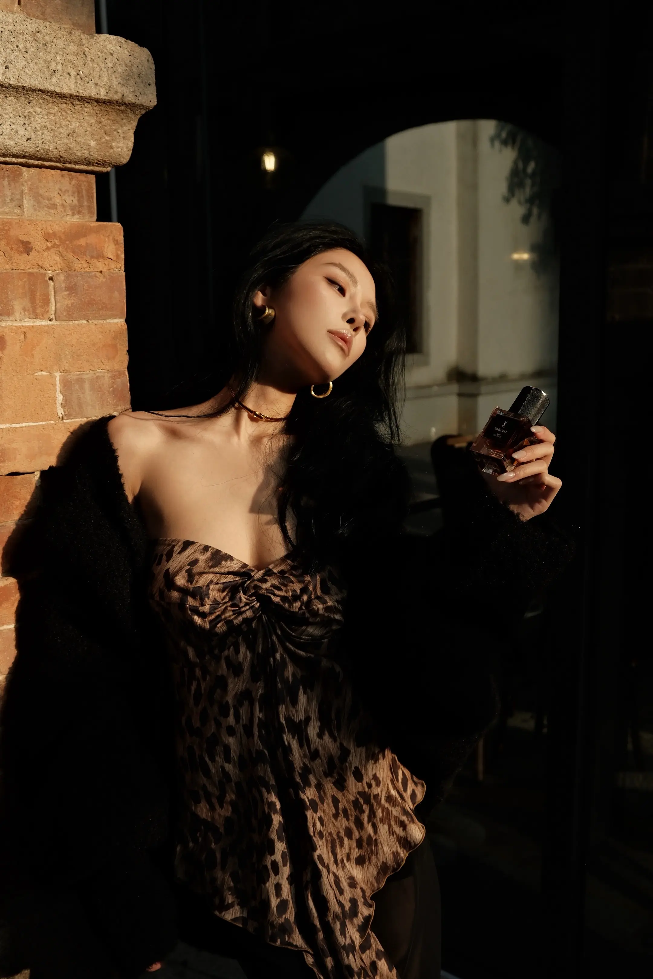 竖条纹旗袍的开叉恰到好处,衬得腿型修长,线条舒展而柔和;肤色均匀且细腻,姿态优雅