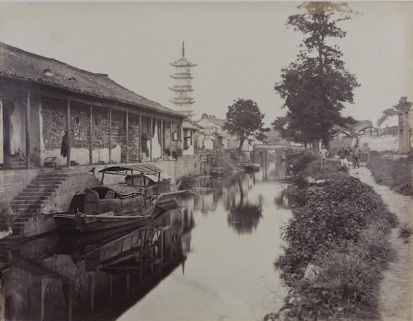 这张拍摄于1870年的照片,是西方摄影师记录的嘉定法华塔与横沥河,也是现存最早展现嘉定古城水乡风貌的影像之一。 画面里,横沥河穿城而过,河水清澈如镜,倒映着两岸的民居与远处的法华塔。河岸边是依水而建的石墙老屋,石阶直接延伸到水边,乌篷船就停泊在石阶旁,充满了江南水乡的日常烟火气。远处的法华塔作为嘉定古城的标志性建筑,七级浮屠的形制清晰可见,是当时嘉定城的视觉中心。