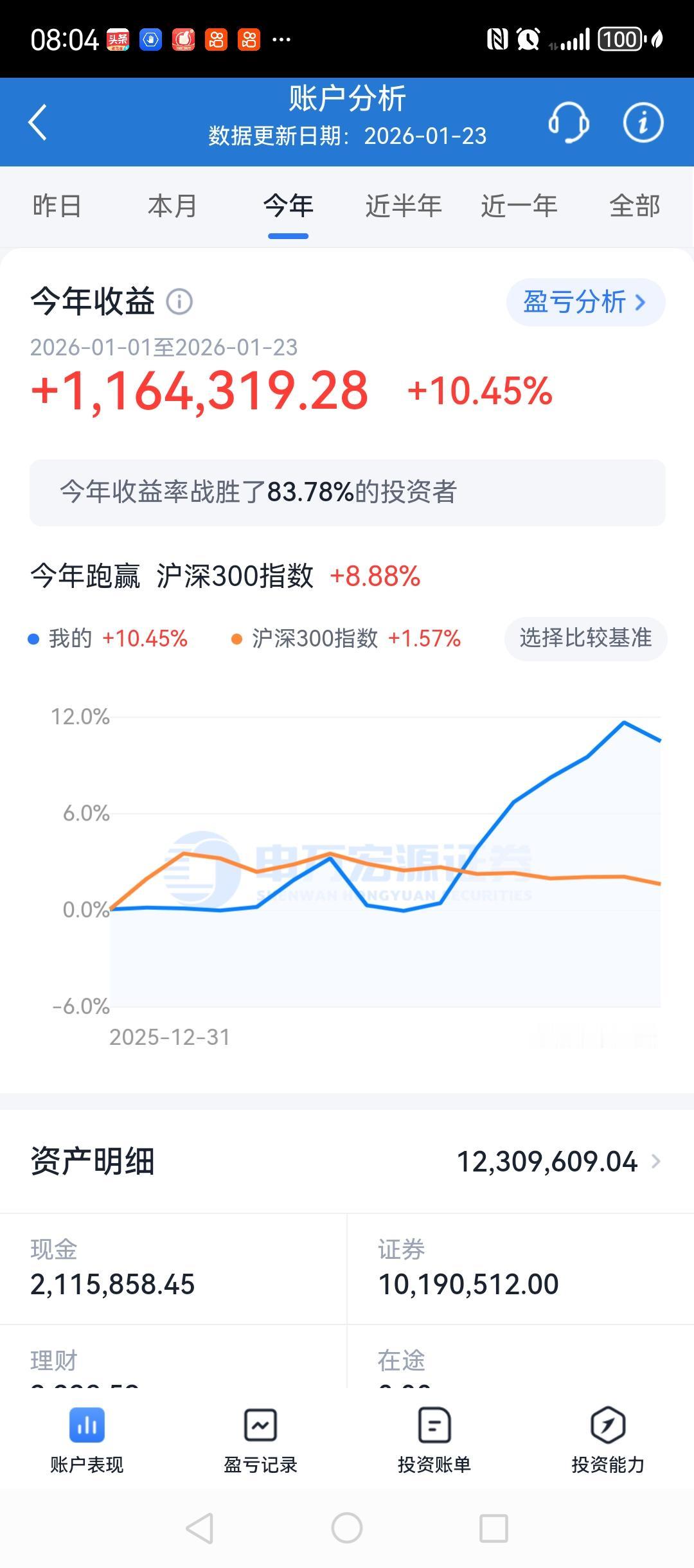 账户在上一周创了好几个记录。 一,账户收益率创了新高,最高时到了463%,最后定格在458%。 二,账户累计收益,首次突破1000万,最高时接近1030万。 三,账户资产在突破1000万后,持股数首次降为两个,之前大部分时间持股在3~4个。 本周,账户中的两个股票都属于人形机器人板块,上涨加速的可能性极大。 我的理念是,好价格买入好股票,不赚钱不卖,甚至不赚大钱不卖。 说的具体一点,就是择时买入处于上升趋势,且相对低位,交易相对活跃的主流行业核心龙头个股,不赚钱不卖,甚至不赚大钱不卖。